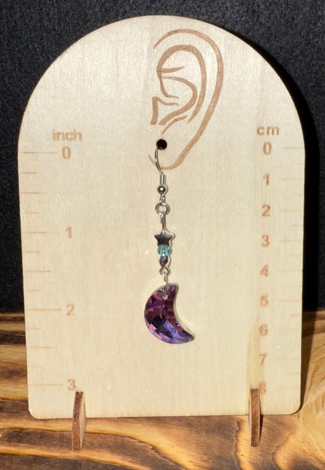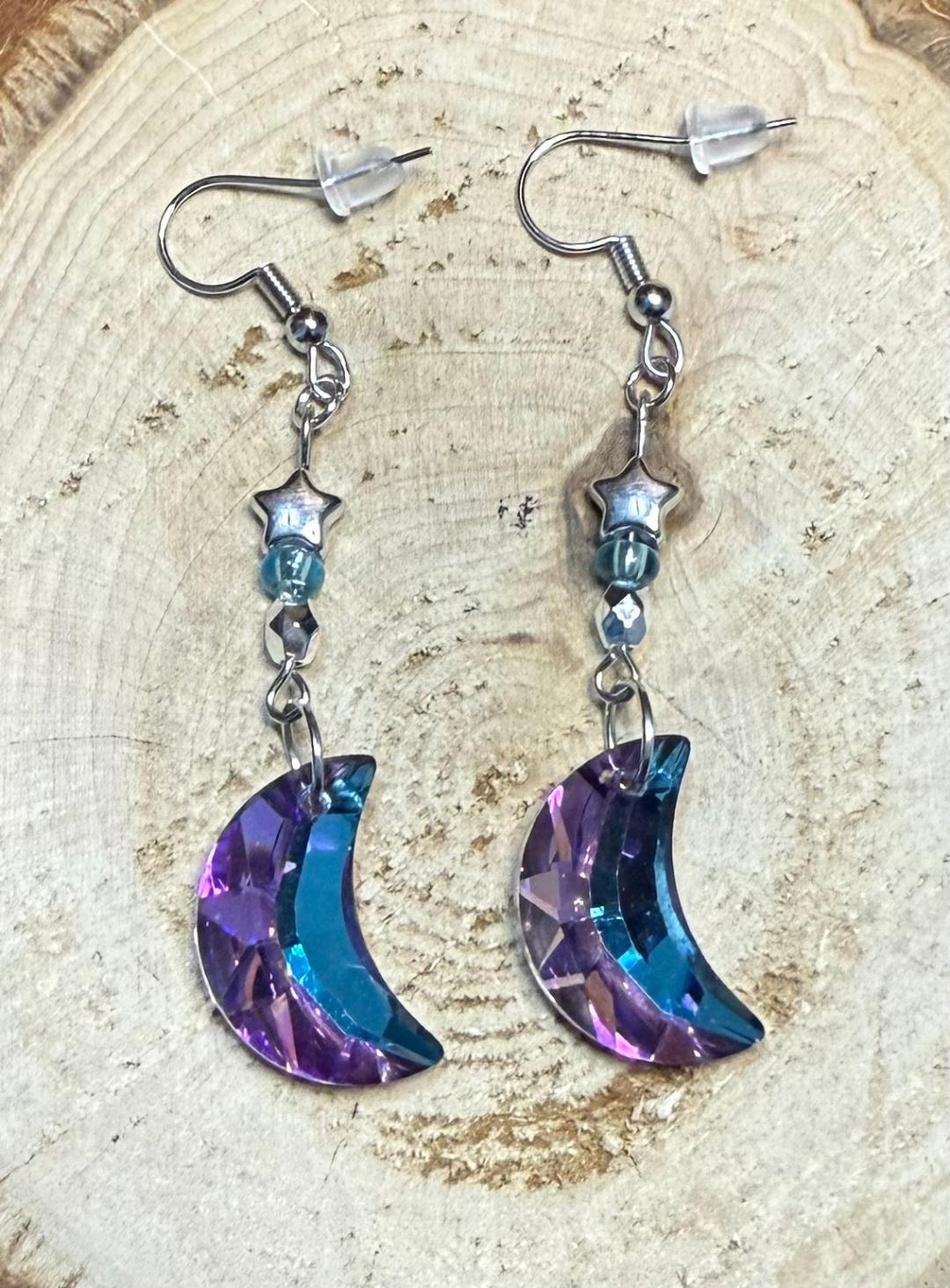 NEW PURPLE & BLUE IRIDESCENT GLASS MOON CHARM EARRINGS