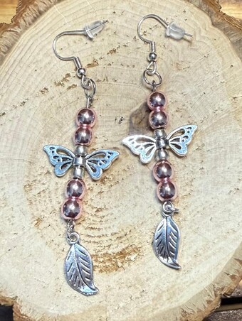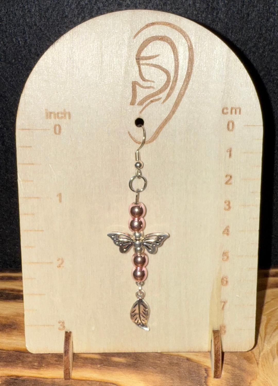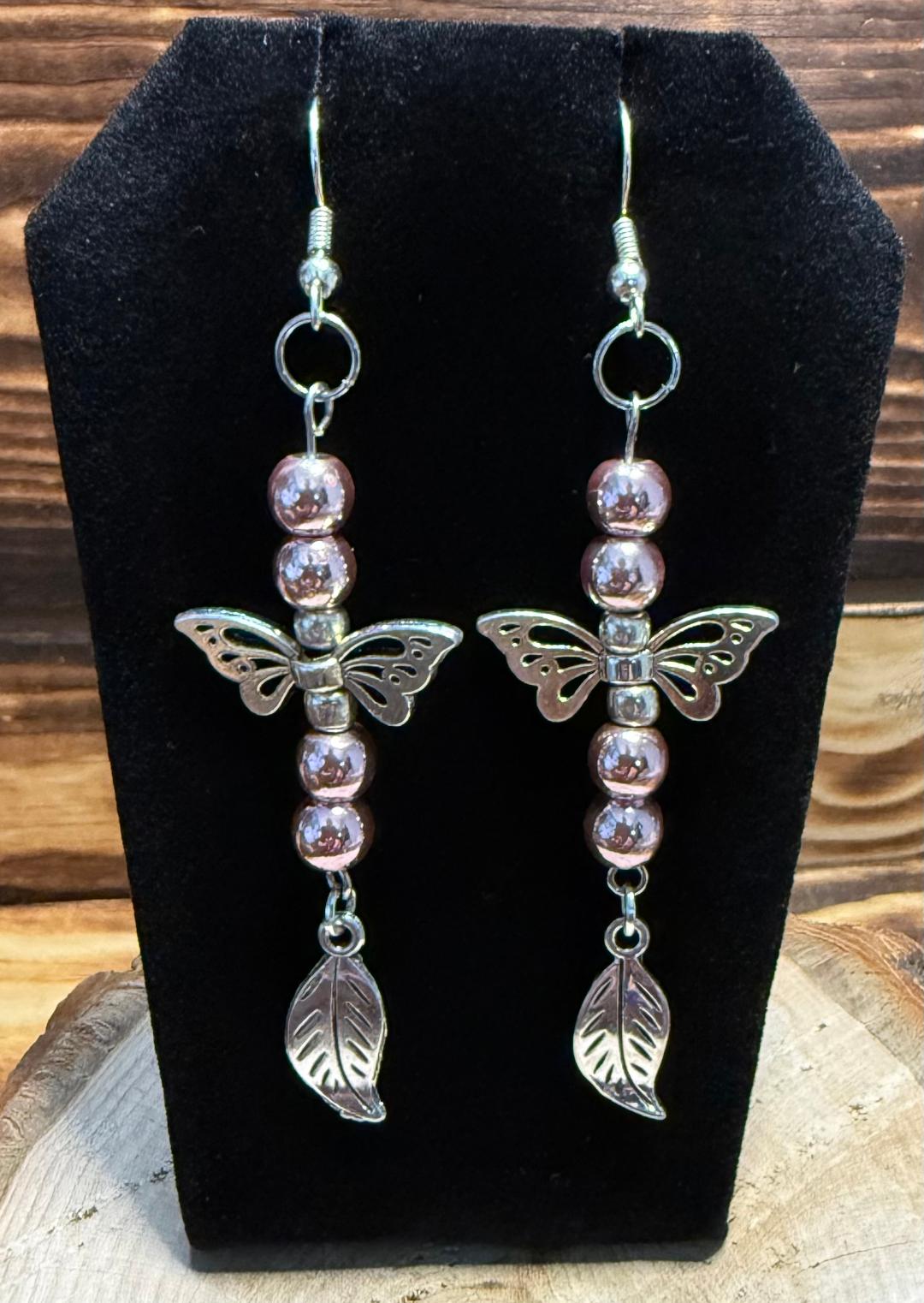NEW BUTTERFLY, LEAF & METALLIC PINK BEAD EARRINGS