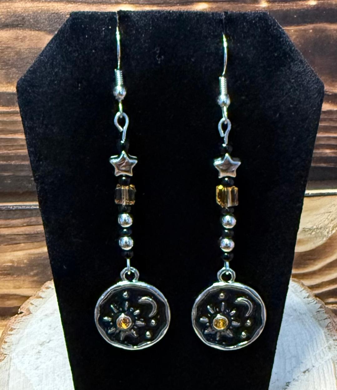 ![]() | Item #: 1005971 Click on image to see more pictures! A mystic style pair of earrings focusing on a circle charm with a raised sun & moon. They are topped with a line of beading that include an amber glass bead, a star shaped silver tone bead and various seed beads. Made with nickel free earring hooks. Measurement Questions? Price: 16.00 |