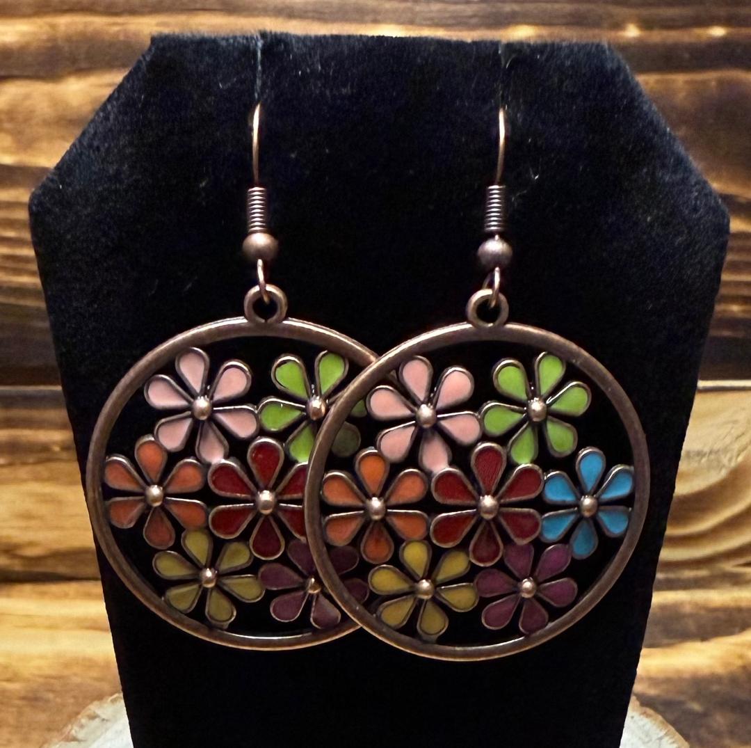 NEW BOHO HIPPIE BRASS HOOP W/ MULTICOLOR ENAMEL FLOWER EARRINGS