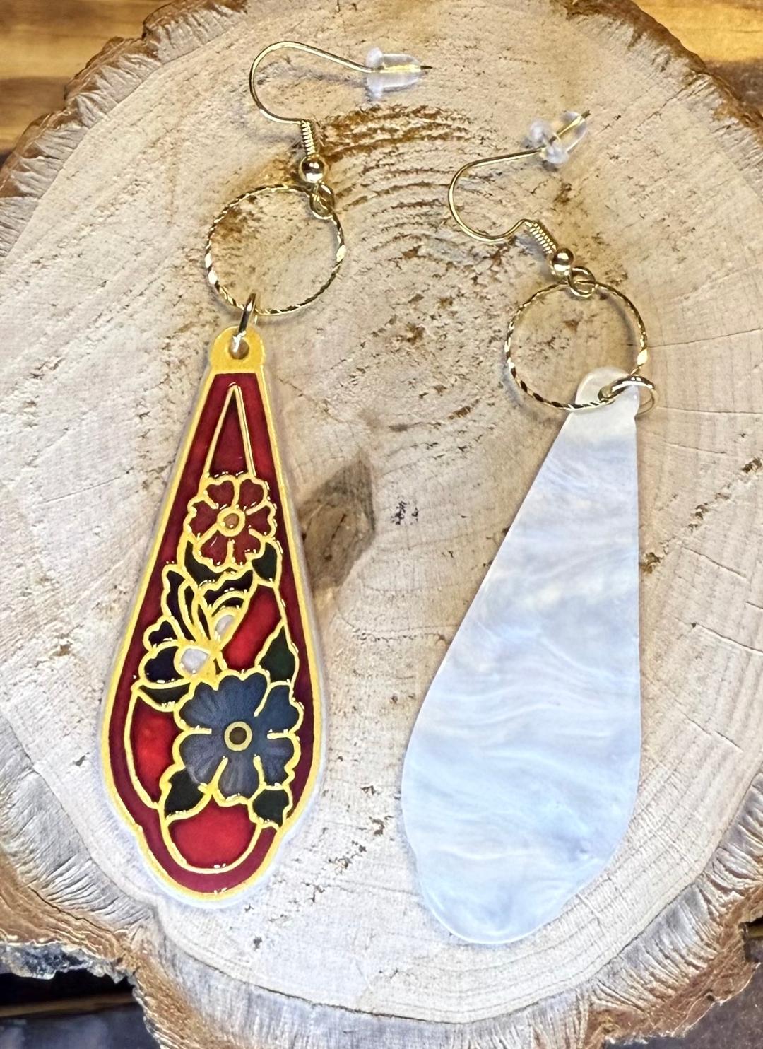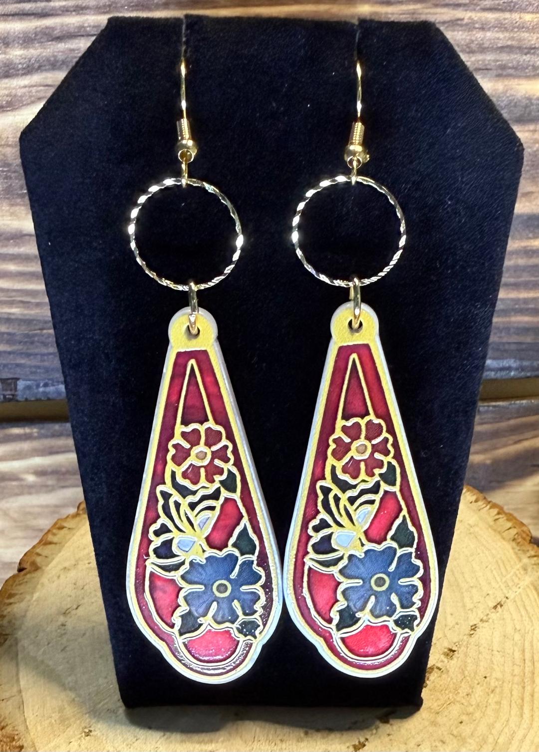 ![]() | Item #: 1006040 Click on image to see more pictures! A lovely pair of extra long, Asian style earrings in red with lovely flowers. They are acrylic (plastic), with a pearlized back. Very light to wear, not heavy on the ears. They have a large embossed gold jump ring for extra dangle. Made with 18K gold plated, nickel free earring hooks. Measurement Questions? Price: 15.00 |
