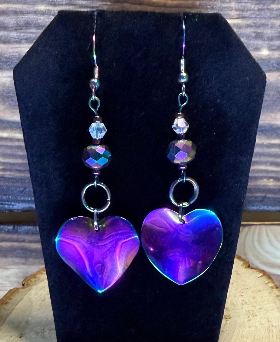 ![]() | Item #: 1006044 Click on image to see more pictures! A metal heart charm with an iridescent finish, purple, blue & pink being the prominent colors. They are topped with iridescent rainbow faceted beads, as well as white faceted beads. Made with rainbow colored, nickel free earring hooks. Measurement Questions? Price: 16.00 |