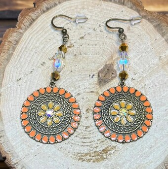 ![]() | Item #: 1006074 Click on image to see more pictures! A pair of Boho earrings with orange colors on a bronze charm, sparkly rhinestone center. They are topped with a gorgeous faceted glass bead as well as champagne gold faceted beads. Made with bronze, nickel free earring hooks. Measurement Questions? Price: 17.00 |