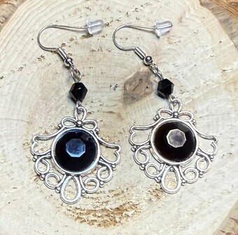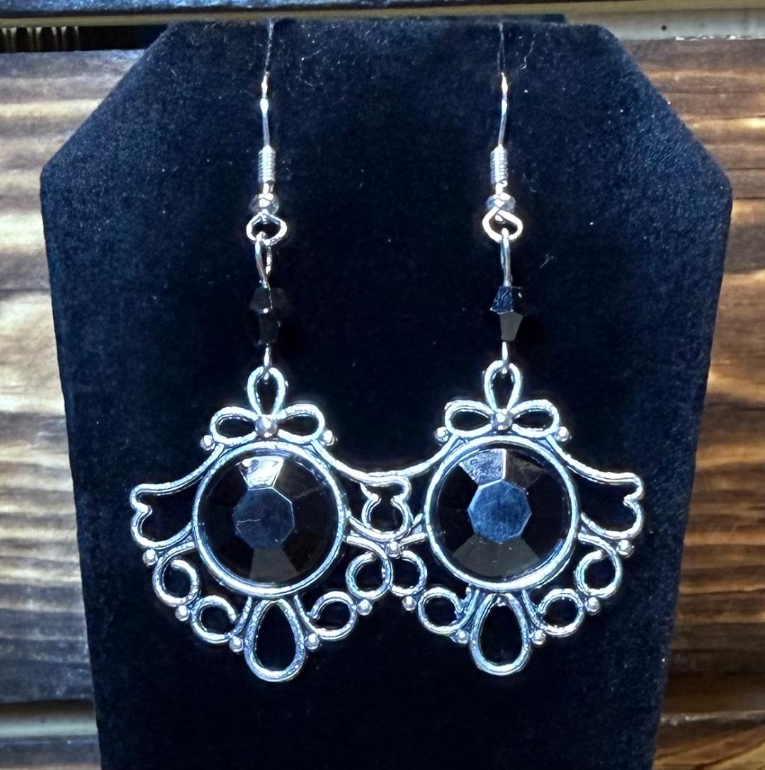 ![]() | Item #: 1006080 Click on image to see more pictures! A lovely pair of filigree silver tone earrings with a large black faceted gem in the center, topped with a small black faceted glass bead. Made with nickel free earring hooks. Measurement Questions? Price: 14.00 |