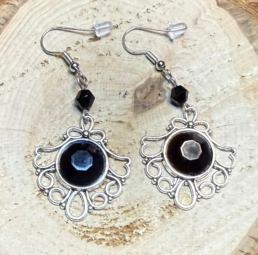 NEW BLACK FACETED GEM CENTER & SMALL BLACK BEAD EARRINGS IN FILIGREE SETTING