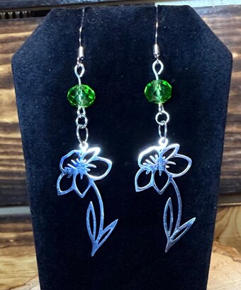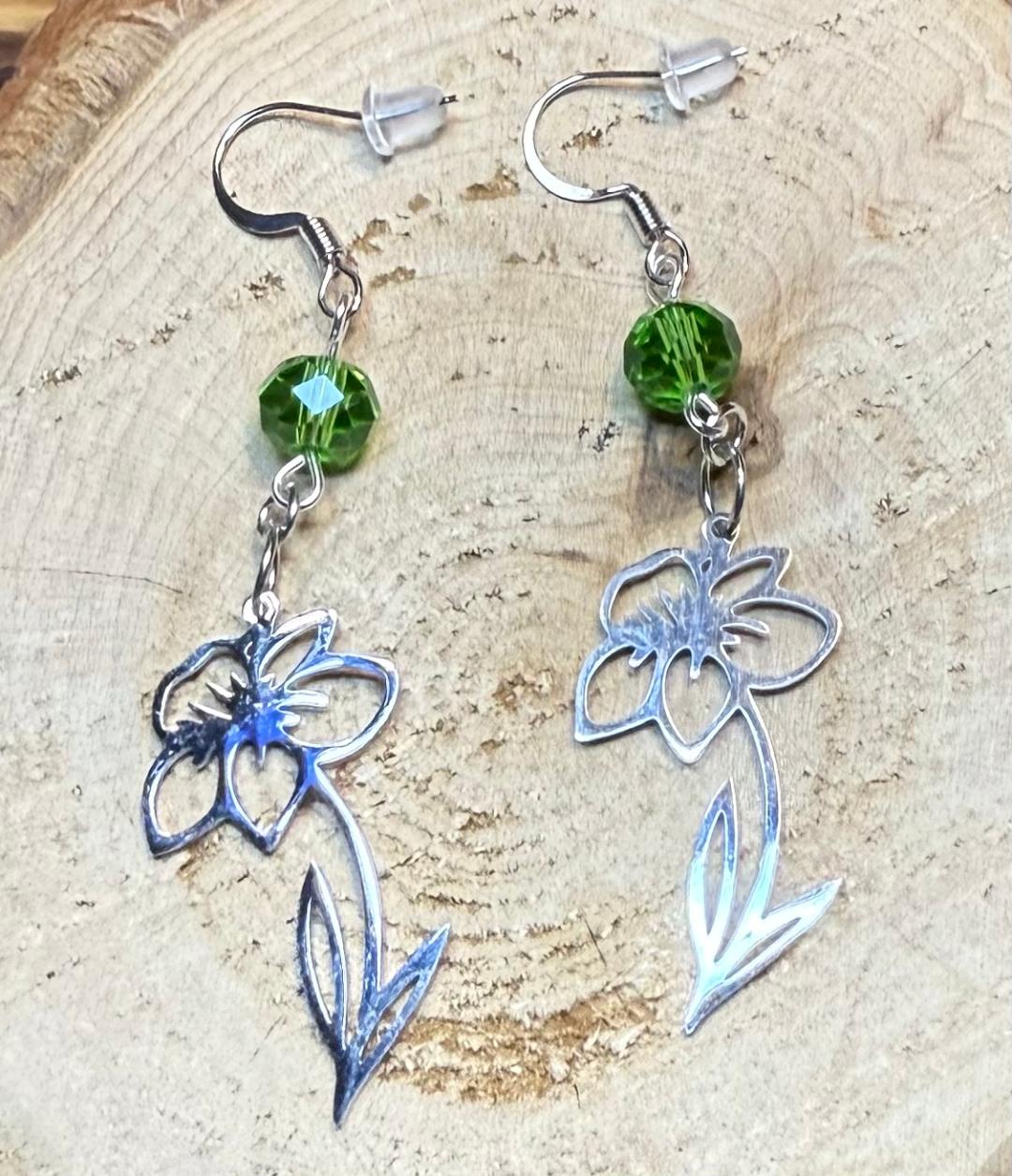 NEW STAINLESS STEEL FLOWER EARRINGS W/ FACETED GREEN GLASS BEAD