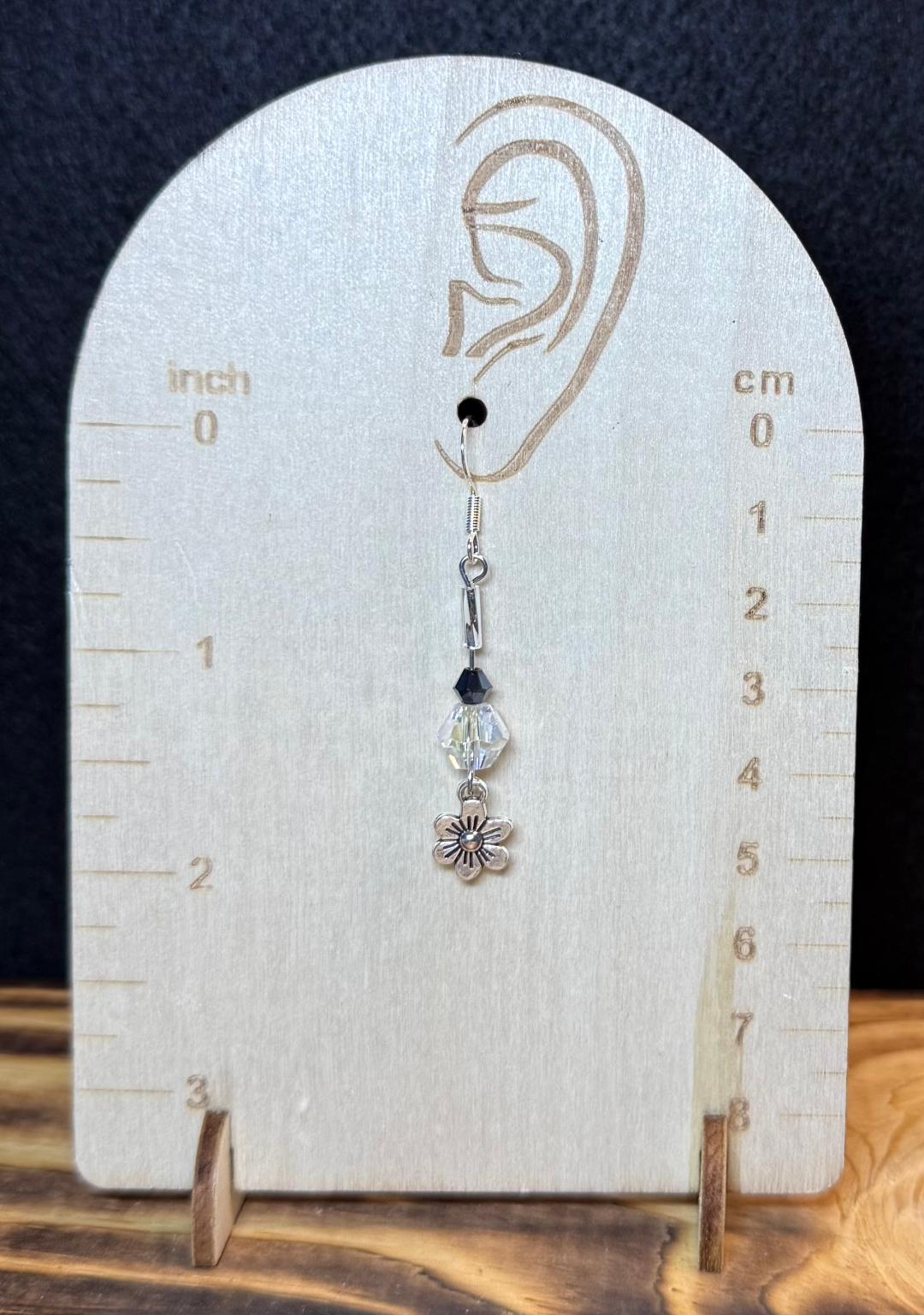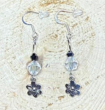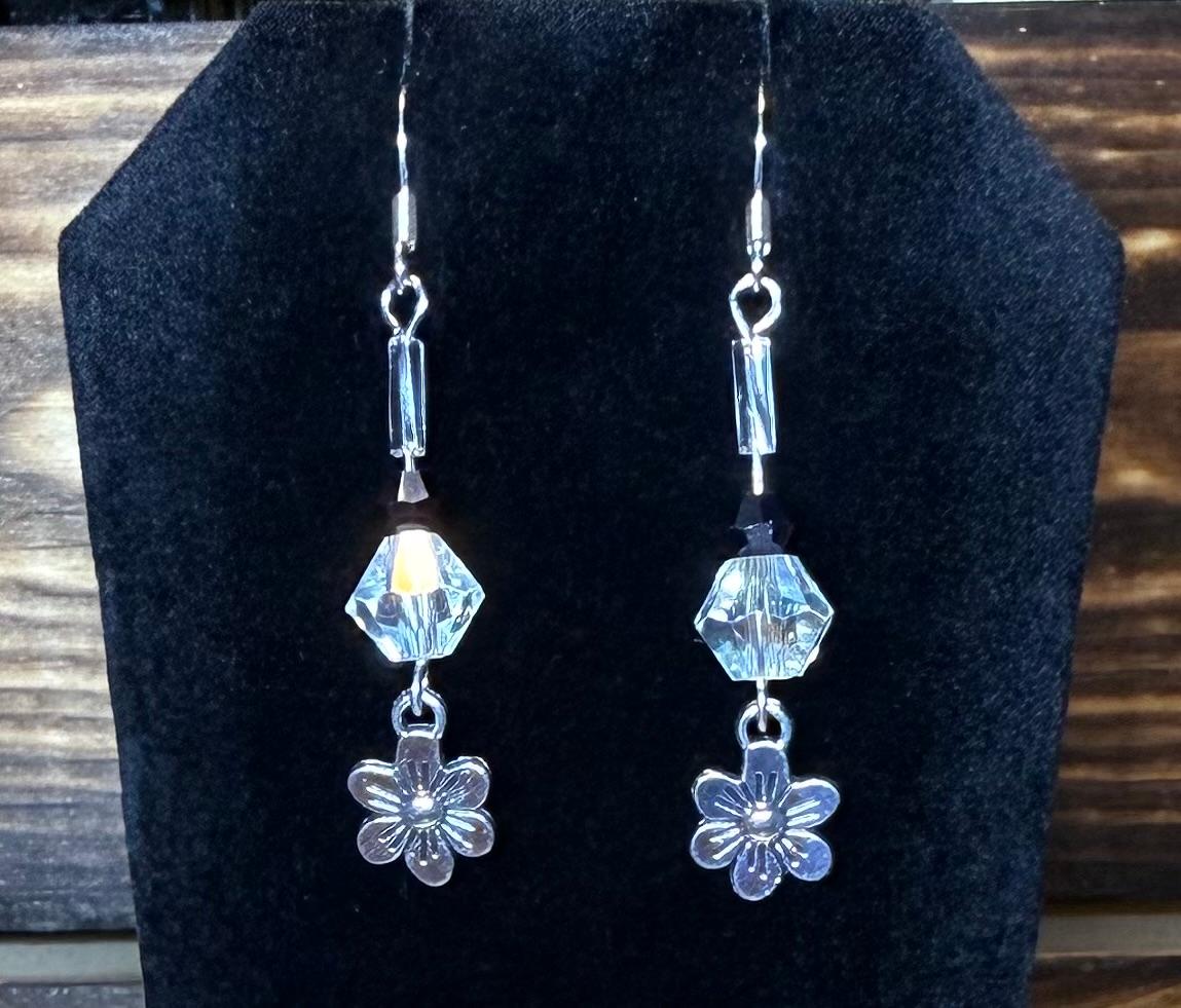 NEW CLEAR & BLACK FACETED GLASS BEAD EARRINGS W/ TINY SILVER FLOWERS