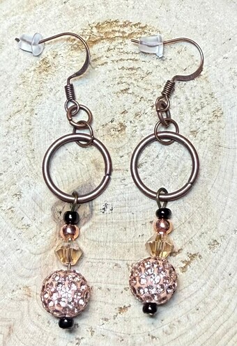 ![]() | Item #: 1006101 Click on image to see more pictures! A very sparkly pair of earrings with a rose gold color rhinestone ball charm, large bronze ring, faceted glass beads. Made with bronze, nickel free earring hooks. Measurement Questions? Price: 15.00 |