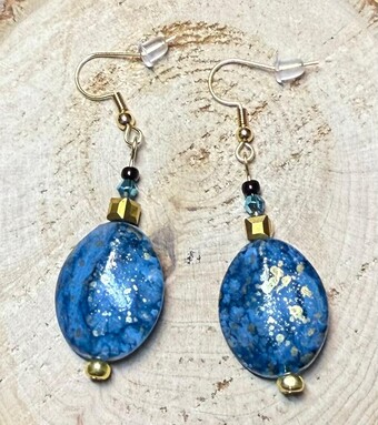 NEW OCEAN BLUE & GOLD OVAL CHARM EARRINGS W/ GLASS BEADS