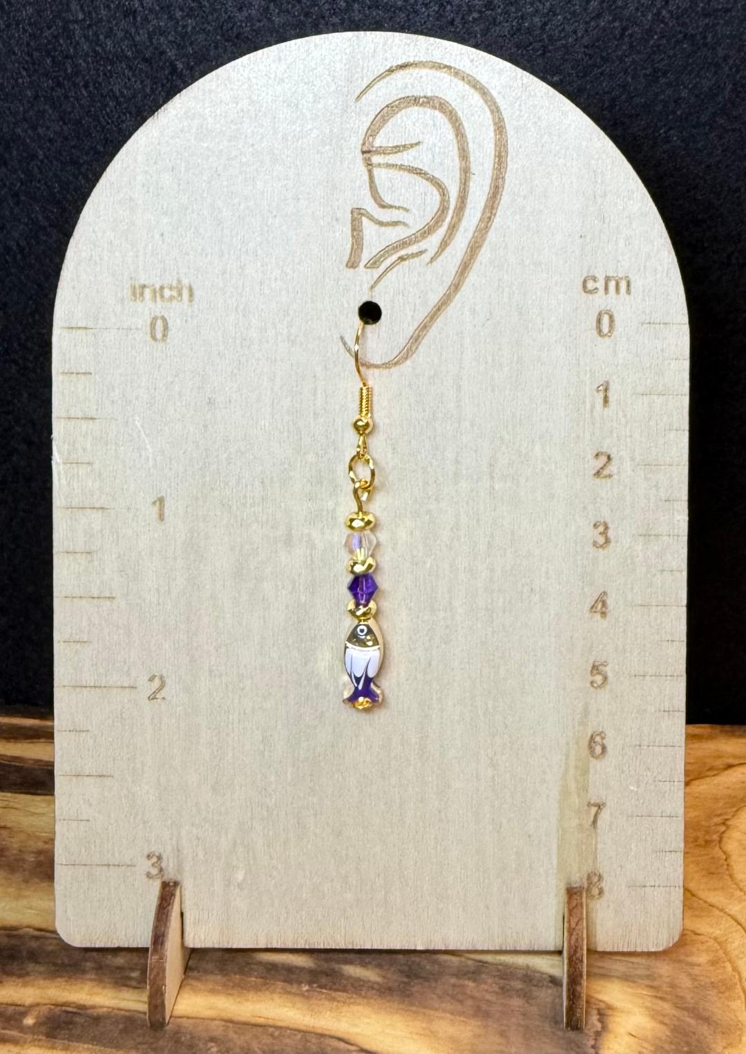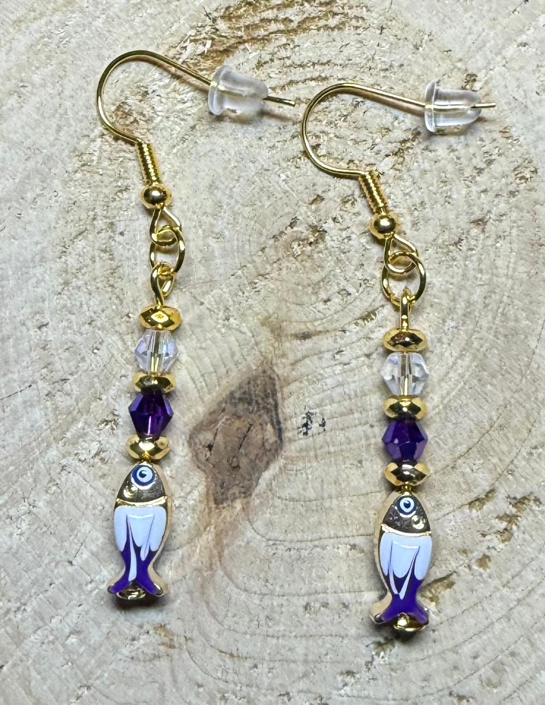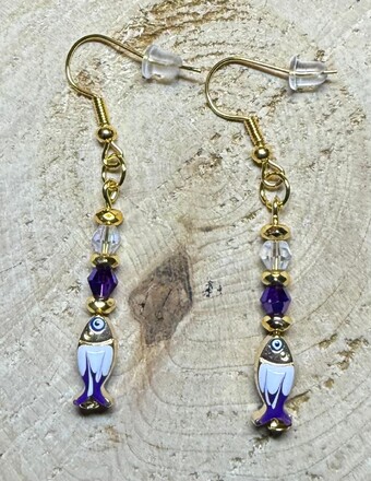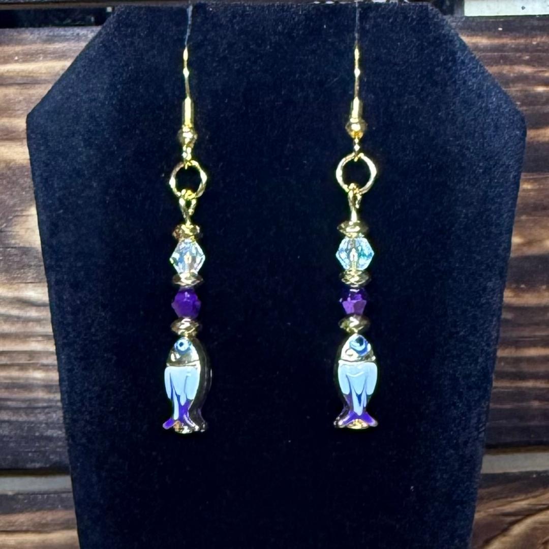 ![]() | Item #: 1006104 Click on image to see more pictures! Dainty little zinc alloy, enamel painted fish charms, purple & white accented. Topped with faceted glass purple & clear glass beads, as well as gold seed beads. Made with nickel free earring hooks. Measurement Questions? Price: 15.00 |