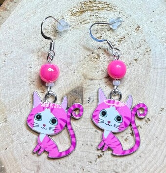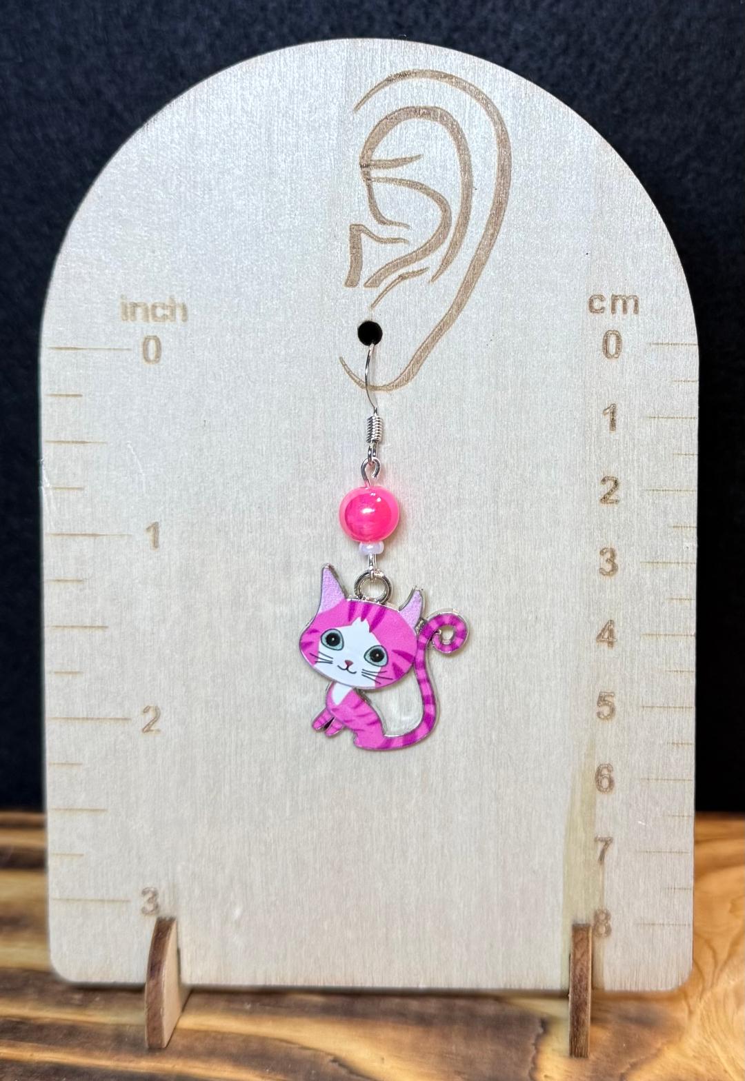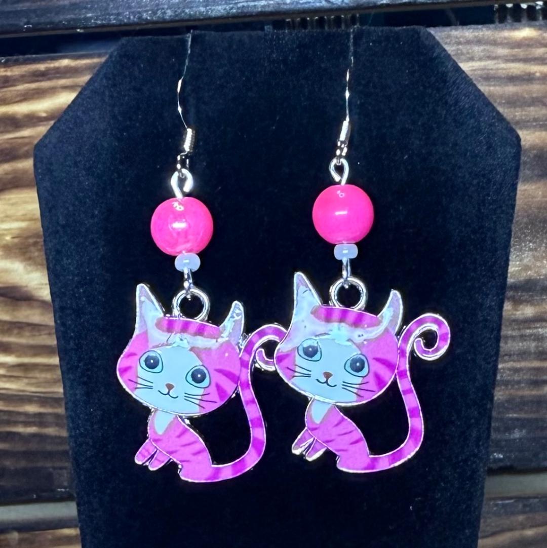 NEW PINK CARTOON ENAMEL CAT KITTEN EARRINGS & HOT PINK BEAD
