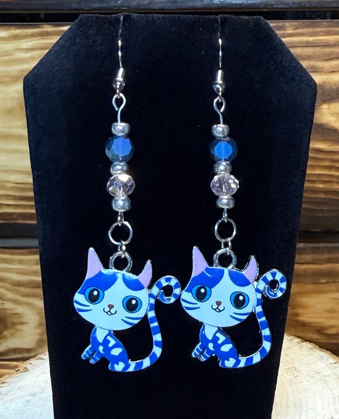 NEW BLUE & PINK CARTOON ENAMEL CAT KITTEN EARRINGS & FACETED GLASS BEAD