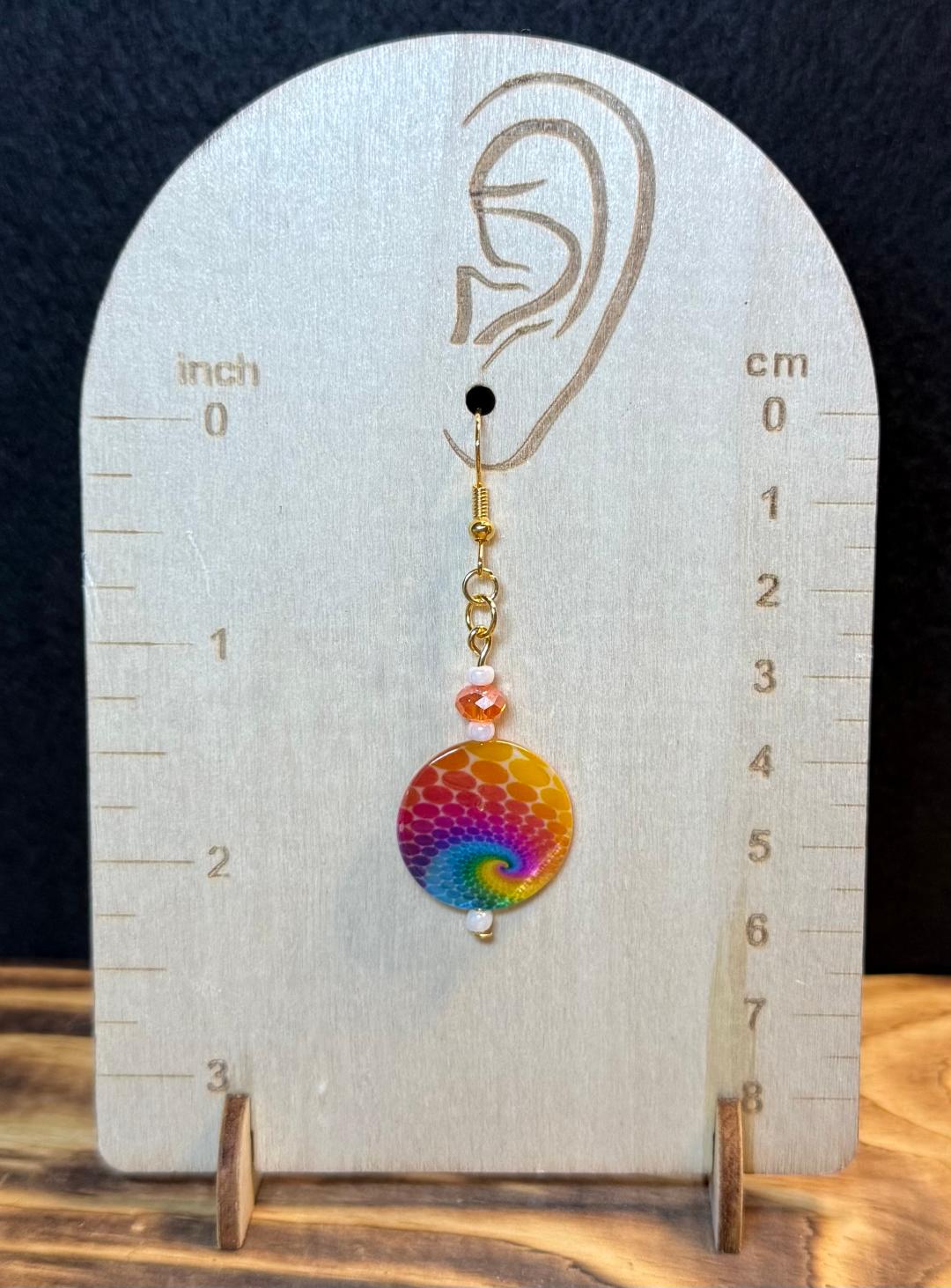 ![]() | Item #: 1006117 Click on image to see more pictures! A fun, hippie boho style pair of earrings in a tie dye swirl of rainbow colors. Topped with an faceted glass orange bead, as well as little white seed beads. Made with nickel free earring hooks. Measurement Questions? Price: 17.00 |
