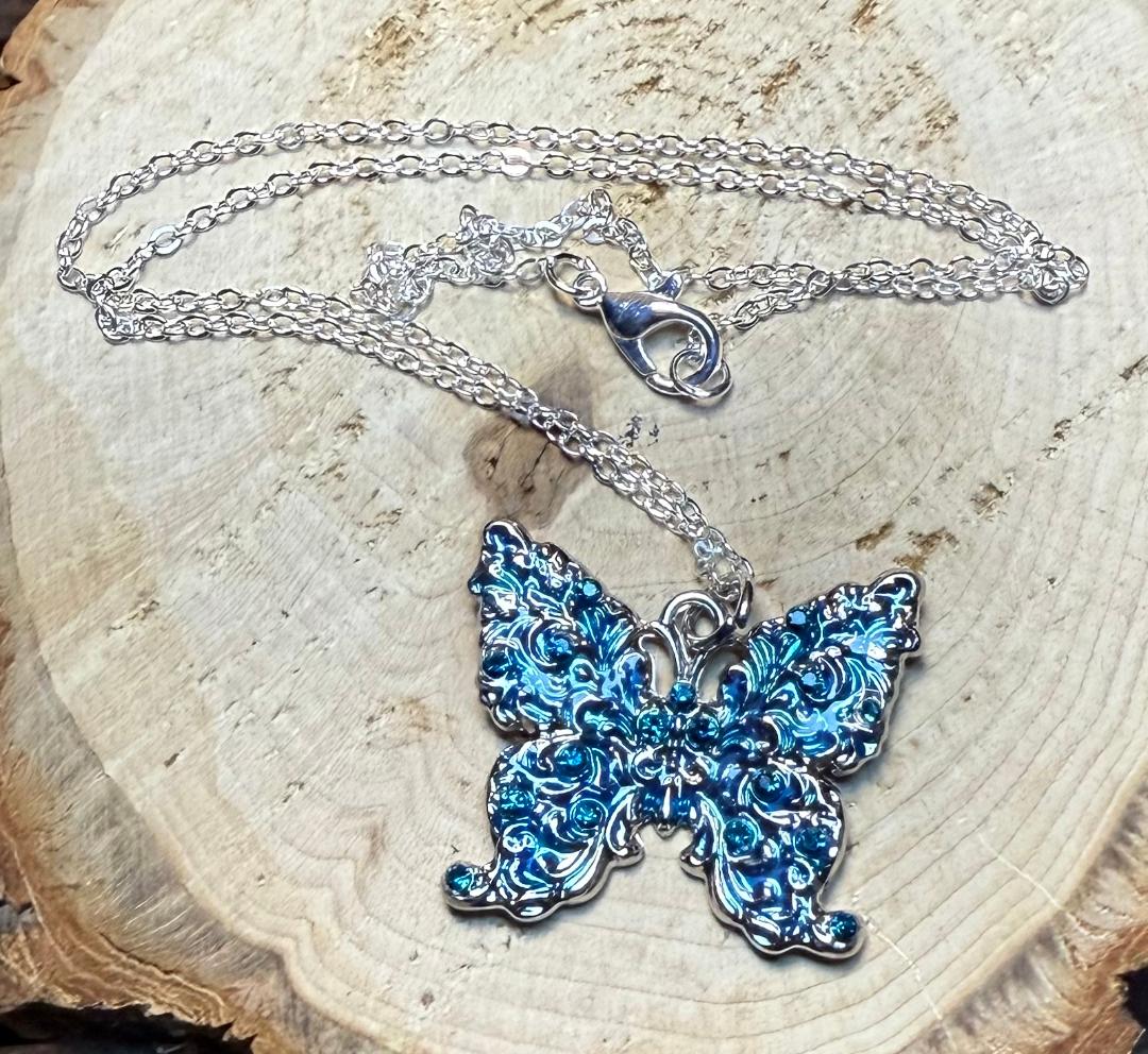 NEW LARGE BLUE RHINESTONE EMBELLISHED BUTTERFLY NECKLACE