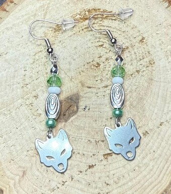 ![]() | Item #: 1006123 Click on image to see more pictures! A pair of Boho earrings consisting of a stainless steel silver tone wolf or fox head charm, topped with green glass beads, a swirl etched silver charm and other beads as well. Made with nickel free earring hooks. Measurement Questions? Price: 18.00 |