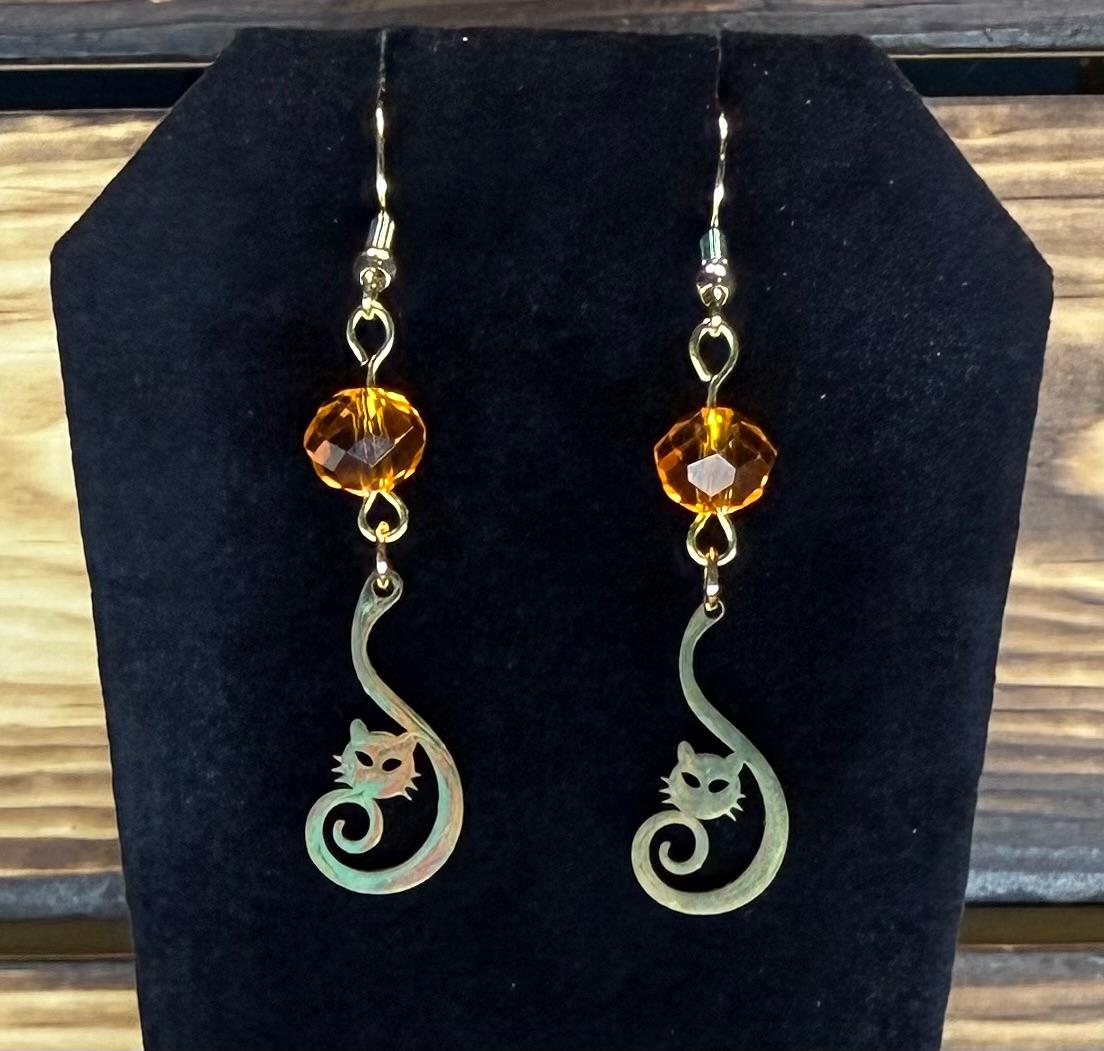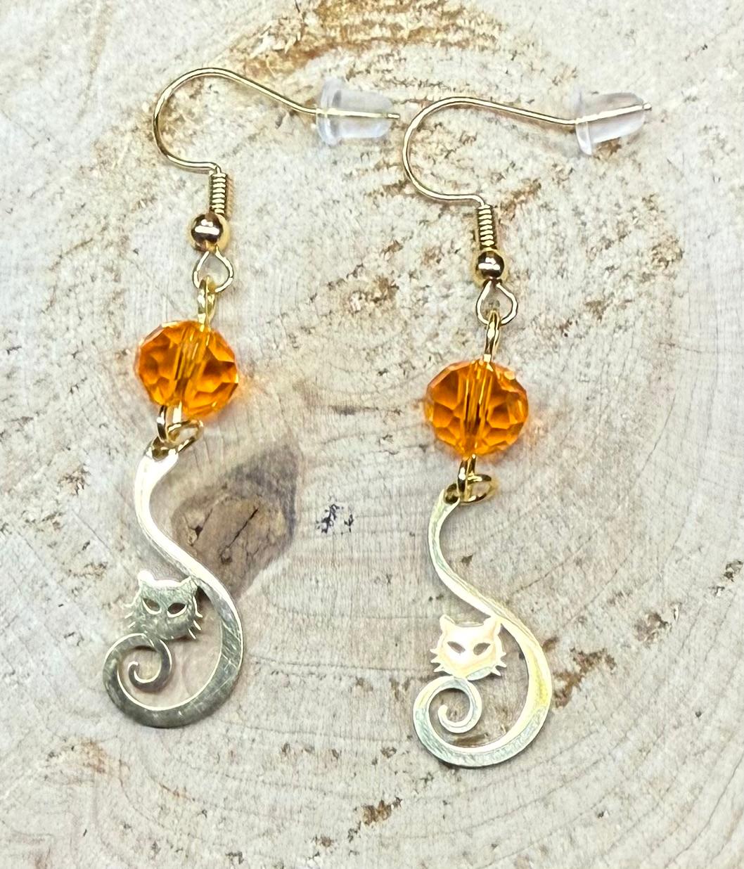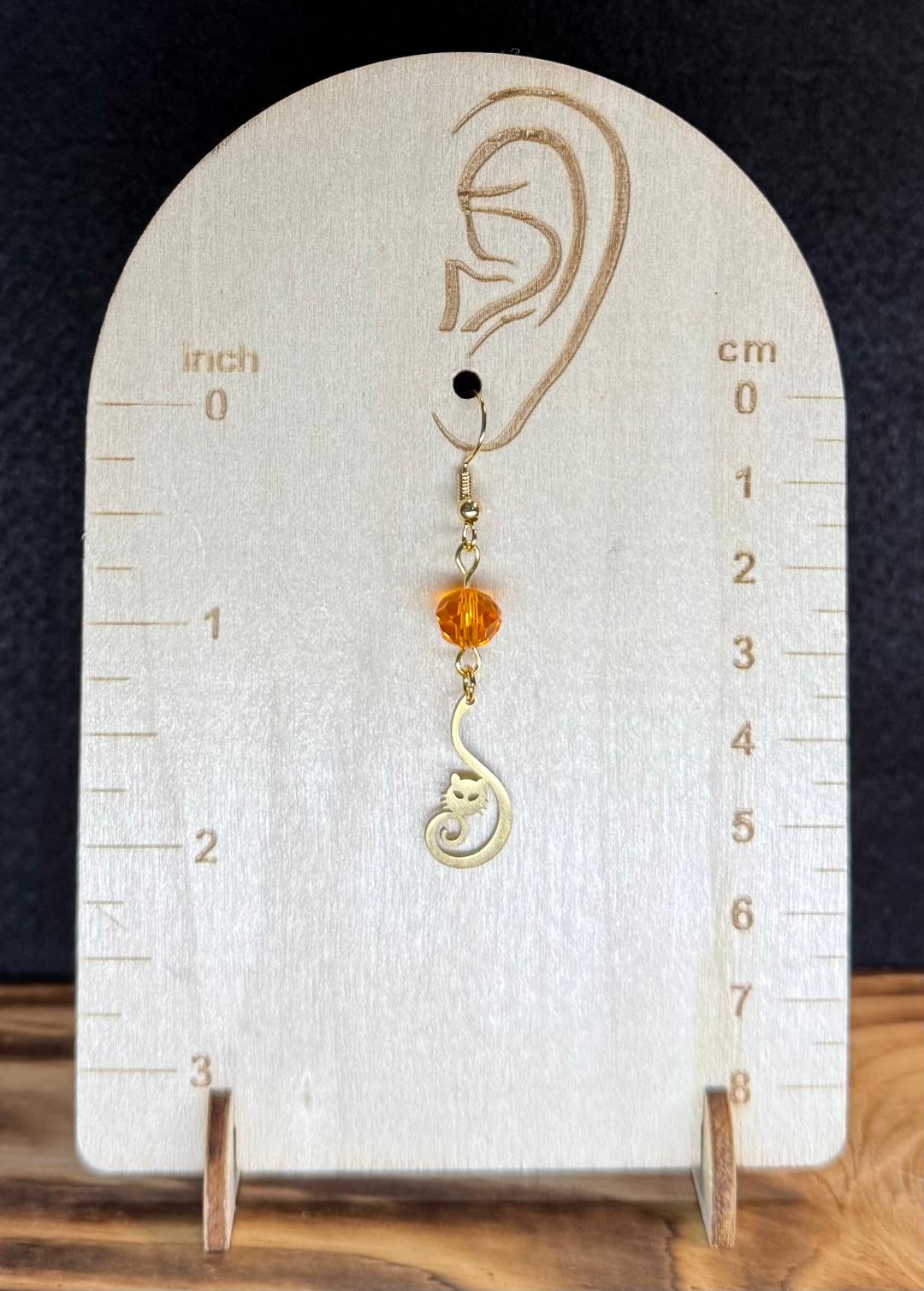 NEW CURLED TAIL STAINLESS STEEL CAT CHARM EARRING W/ ORANGE GLASS FACETED BEADS