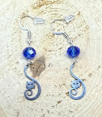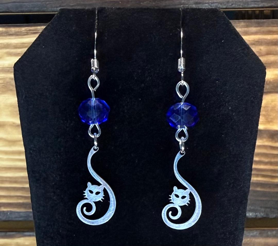 NEW CURLED TAIL STAINLESS STEEL CAT CHARM EARRING W/ BLUE GLASS FACETED BEADS
