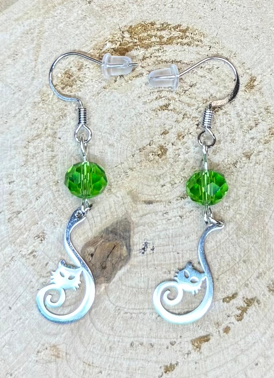 NEW CURLED TAIL STAINLESS STEEL CAT CHARM EARRING W/ GREEN GLASS FACETED BEADS