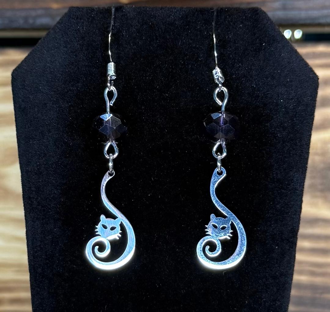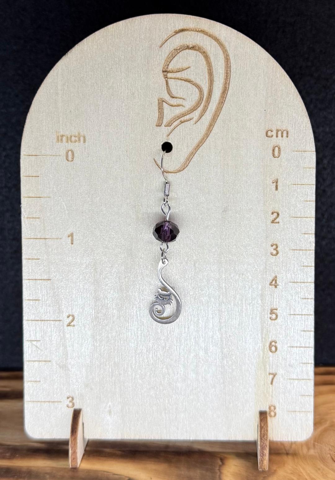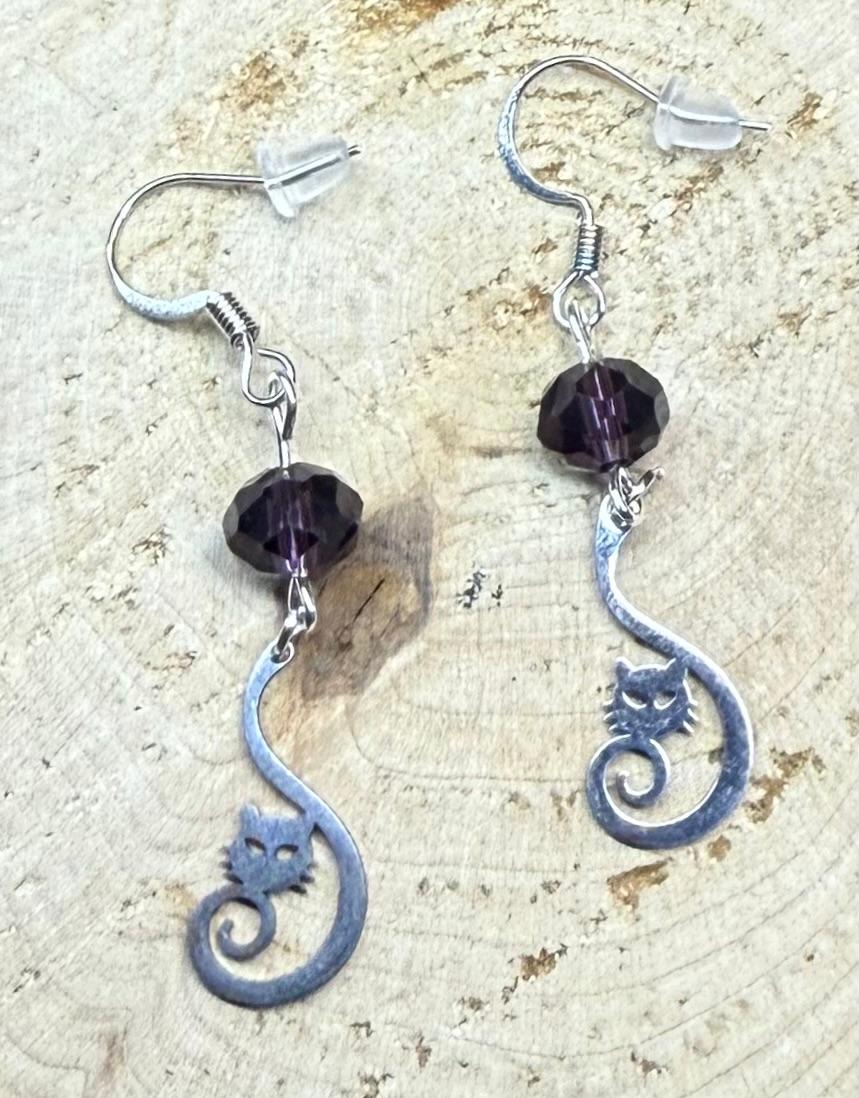 NEW CURLED TAIL STAINLESS STEEL CAT CHARM EARRING W/ PURPLE GLASS FACETED BEADS