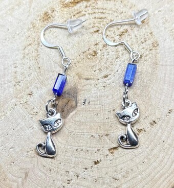 ![]() | Item #: 1006143 Click on image to see more pictures! Retro atomic cat charms in a silver tone, topped with royal blue glass bugle beads. Made with silver plated, nickel free earring hooks. Measurement Questions? Price: 15.00 |