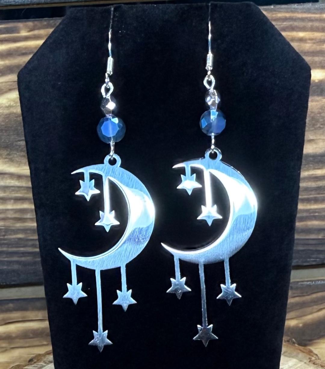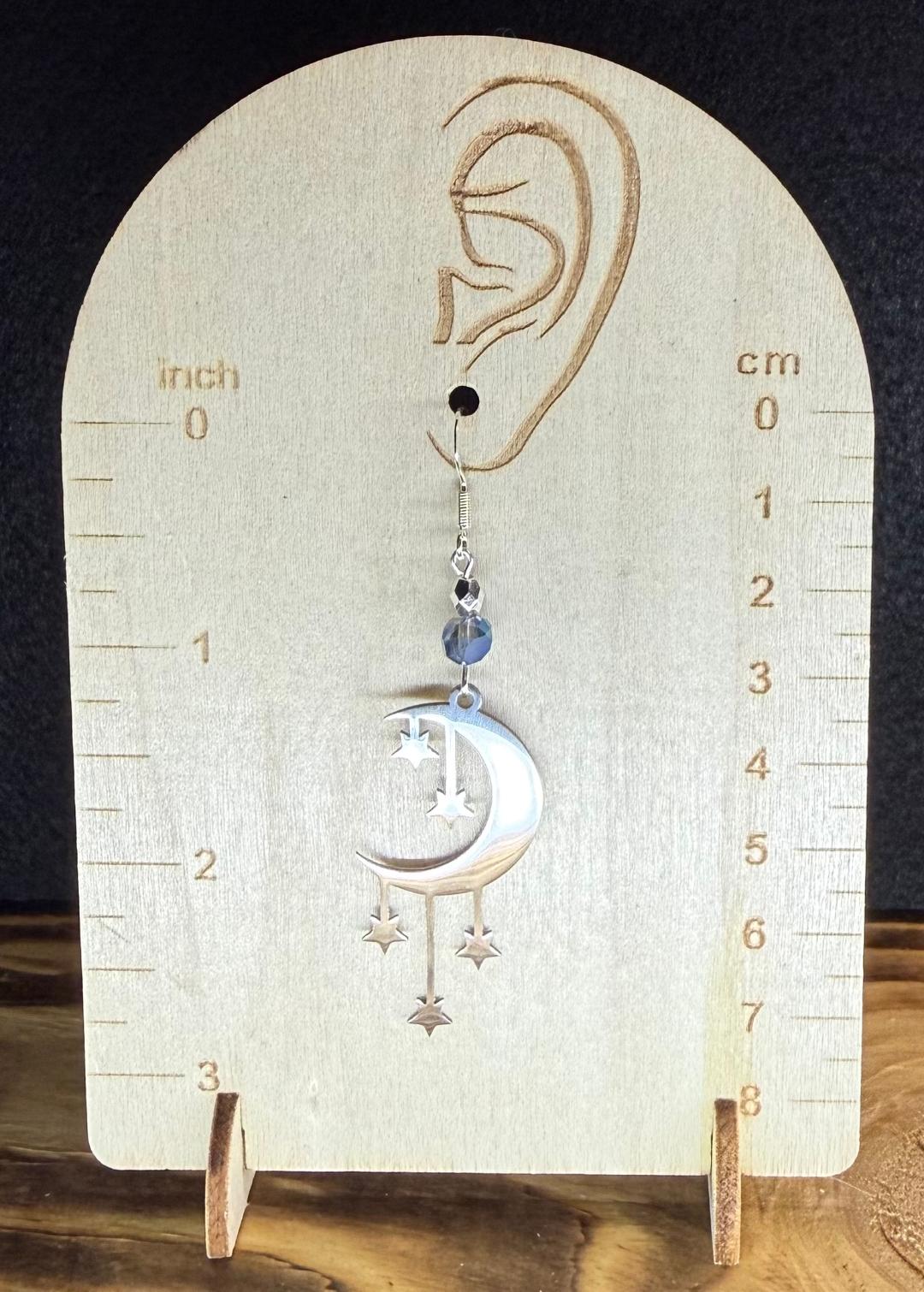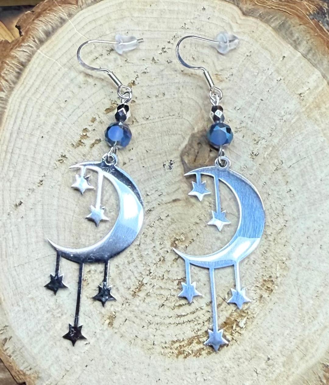 NEW CELESTIAL MOON & FALLING STARS STAINLESS STEEL EARRINGS W/ BLUE BEADS