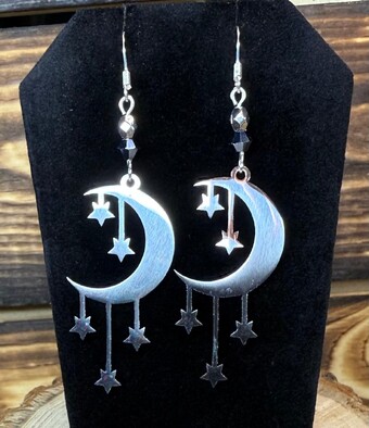 ![]() | Item #: 1006150 Click on image to see more pictures! A celestial themed pair of stainless steel earrings focused on a moon with falling stars. Topped with a silver grey plated glass faceted bead and made with silver plated, nickel free earring hooks. Measurement Questions? Price: 19.00 |
