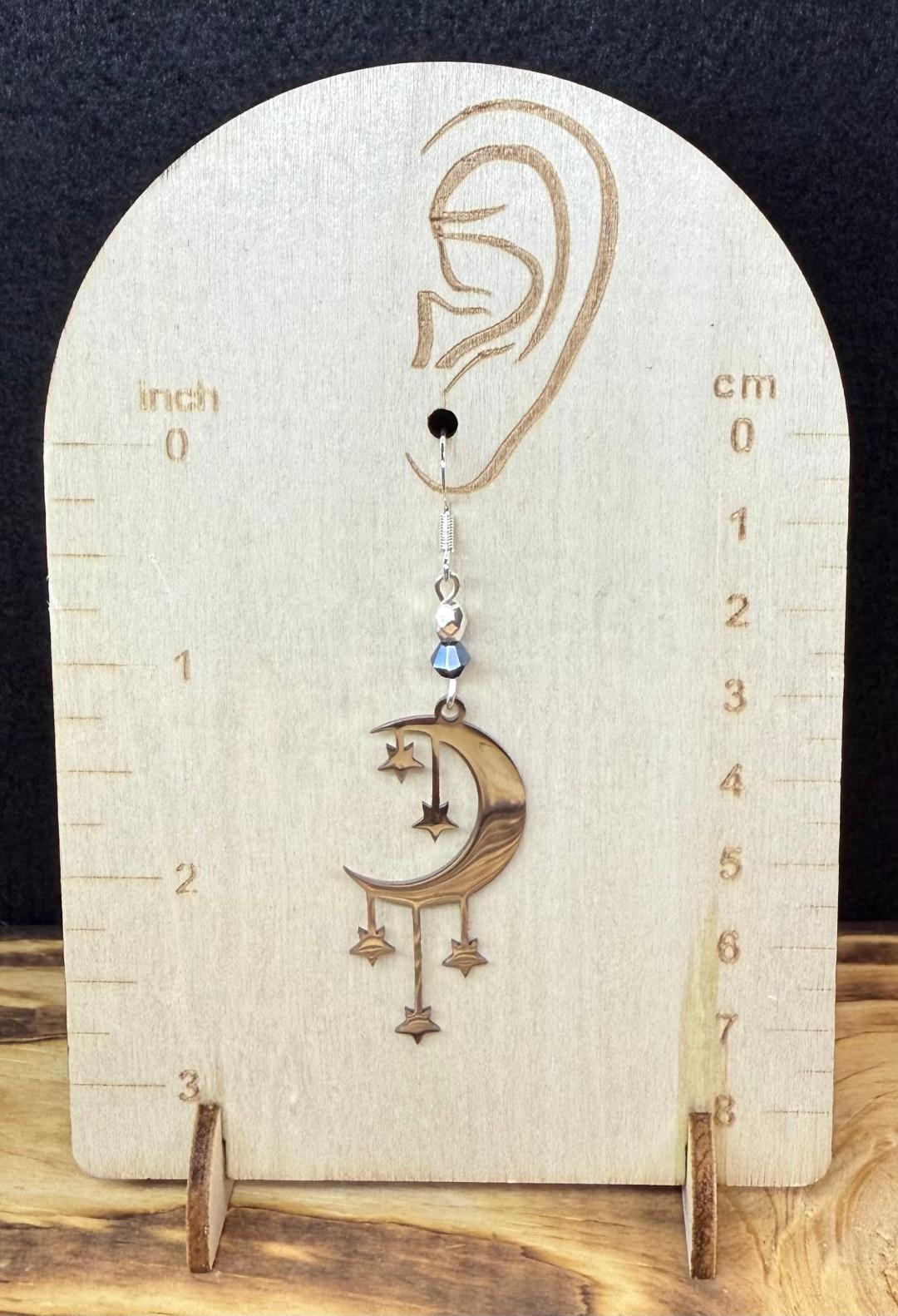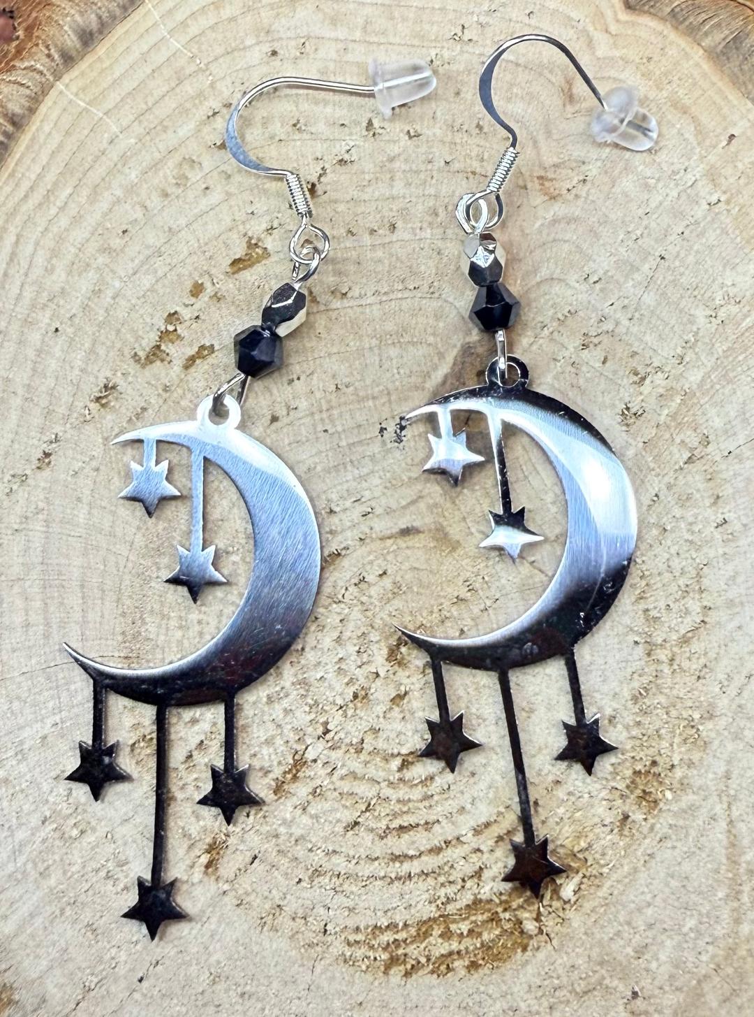 NEW CELESTIAL MOON & FALLING STARS STAINLESS STEEL EARRINGS W/ SILVER GREY BEADS