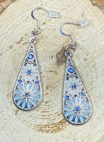![]() | Item #: 1006151 Click on image to see more pictures! A sparkling pair of longer style teardrop zinc alloy earrings decorated with beautiful blue rhinestones and a flower theme. They are a little on the heavy side, topped with silver plated, nickel free earring hooks. Measurement Questions? Price: 16.00 |