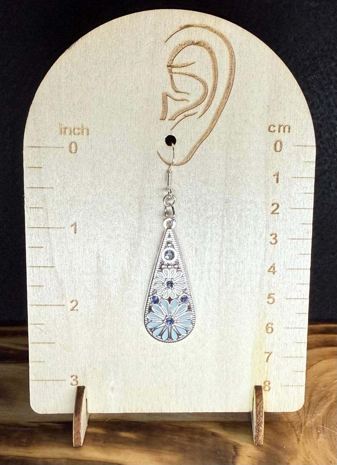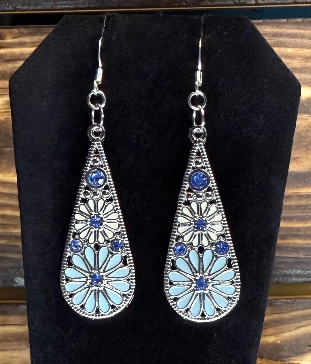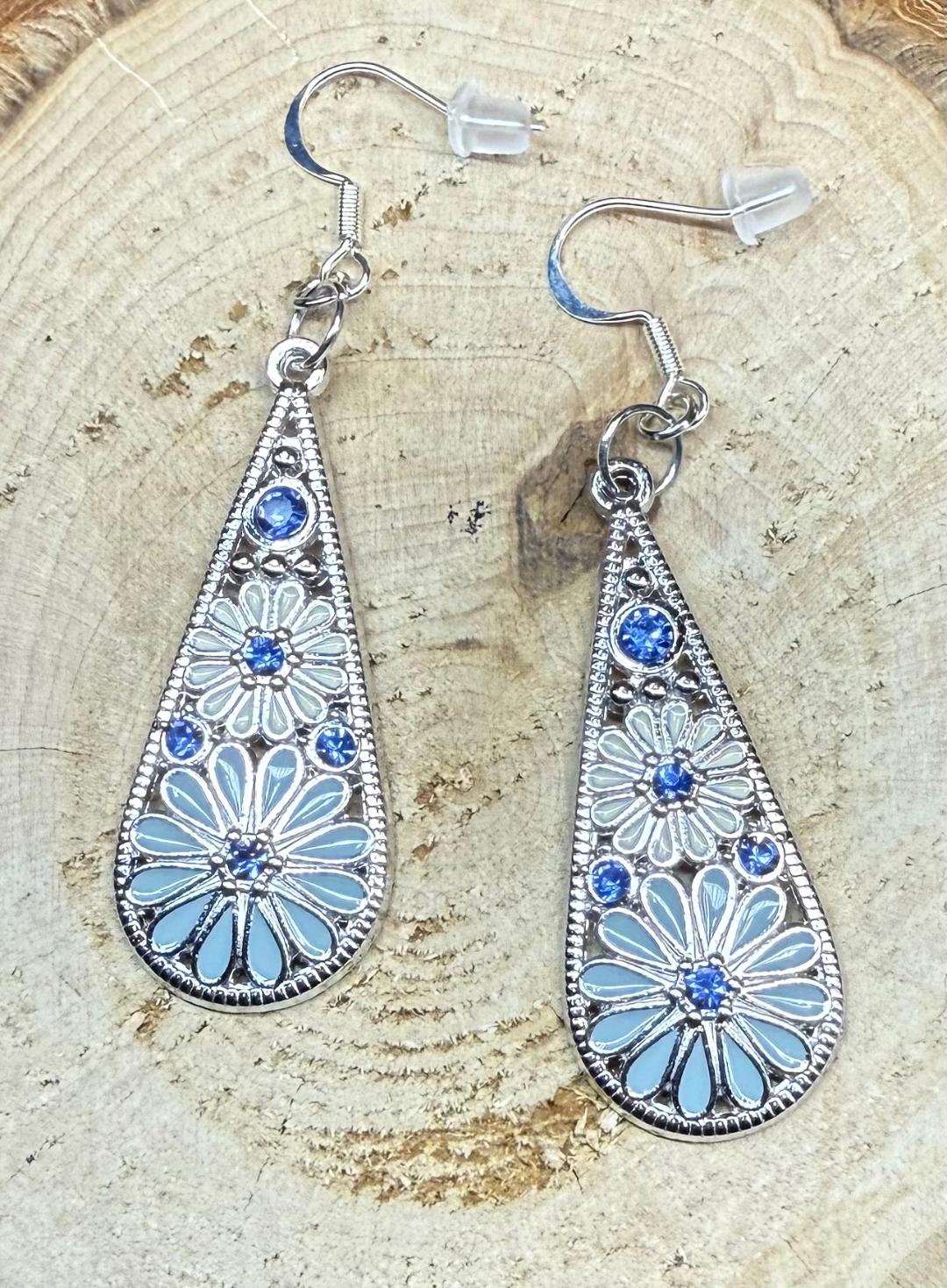 NEW LONG SILVER ALLOY FLOWER TEARDROP EARRINGS W/ BLUE RHINESTONES
