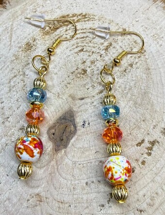 ![]() | Item #: 1006159 Click on image to see more pictures! Vibrant earrings with the focal point being a round white bead with splashes of color throughout. There are faceted glass blue and orange beads above, as well as tiny gold tone barrel beads. Measurement Questions? Price: 16.00 |