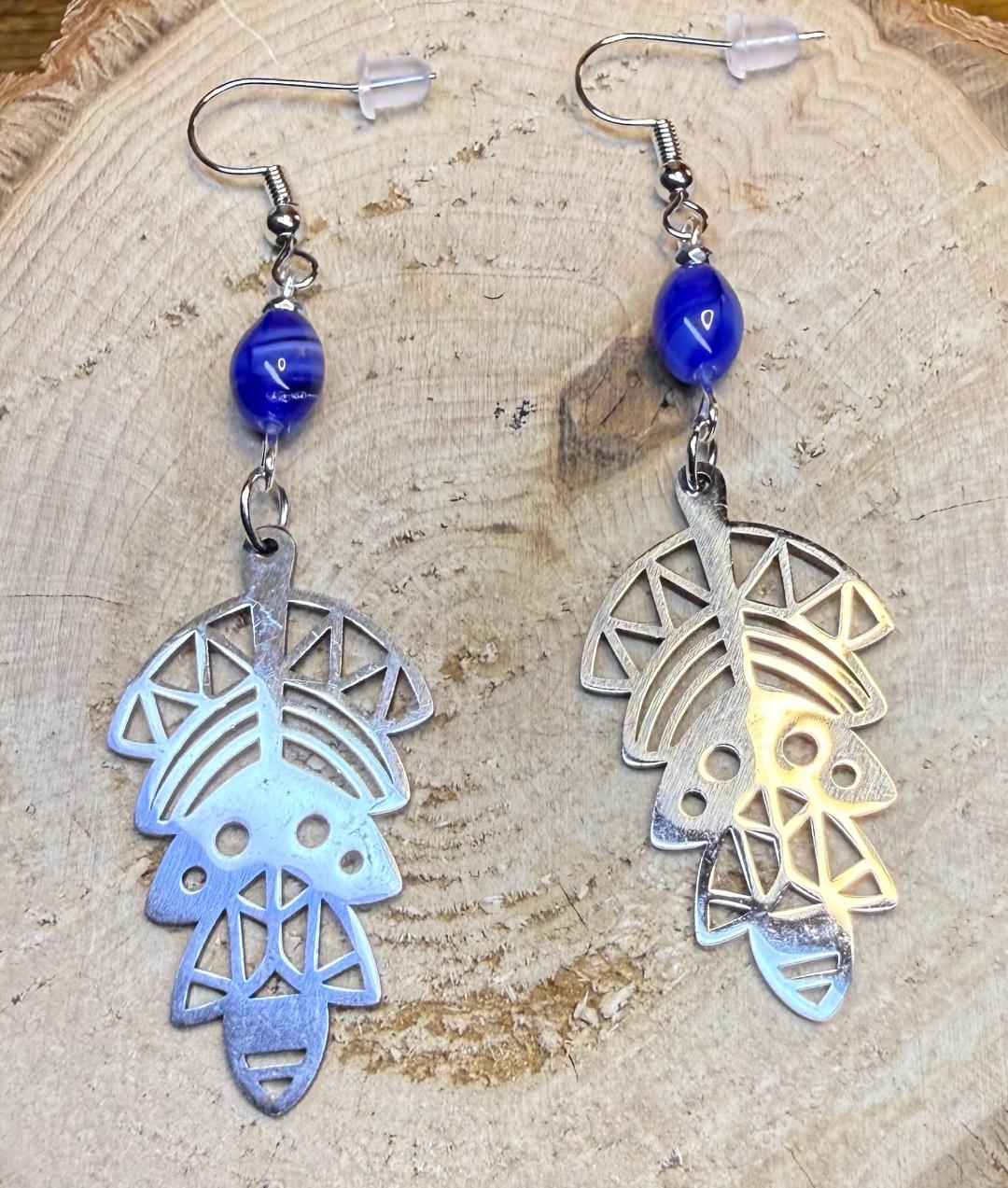 NEW SOUTHWESTERN STYLE STAINLESS STEEL SYMBOL EARRINGS W/ MARBLED BLUE GLASS BEAD