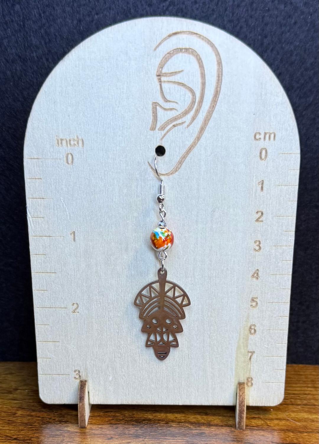 ![]() | Item #: 1006162 Click on image to see more pictures! An Aztec or Southwestern style symbol shape in stainless steel, topped with a multicolored round bead. Made with nickel free earring hooks. Measurement Questions? Price: 18.00 |