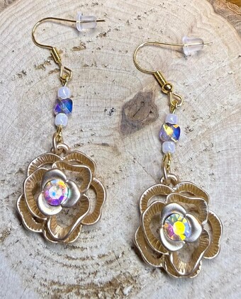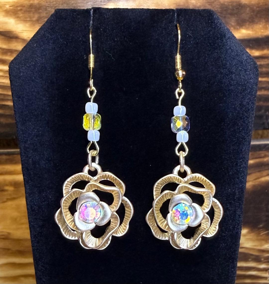 NEW GOLD ROSE CHARM EARRINGS W/ IRIDESCENT RHINESTONES & BEADS
