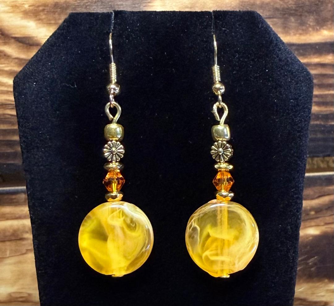 NEW ROUND YELLOW MARBLED CHARM W/ FLOWER & GLASS BEADED EARRINGS