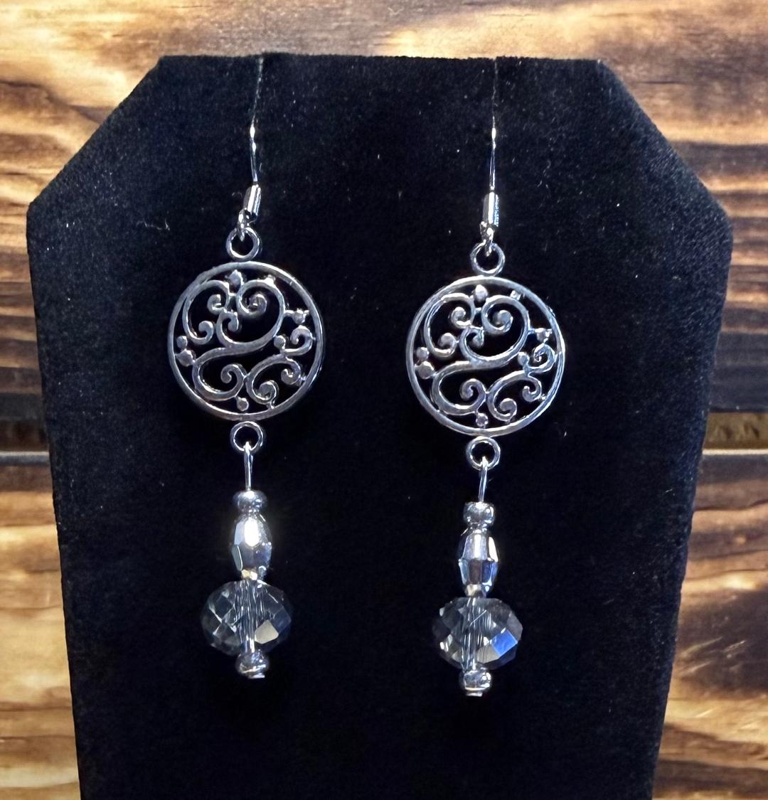 NEW FILIGREE SWIRL CHARM EARRINGS W/ FACETED SILVER GLASS BEAD