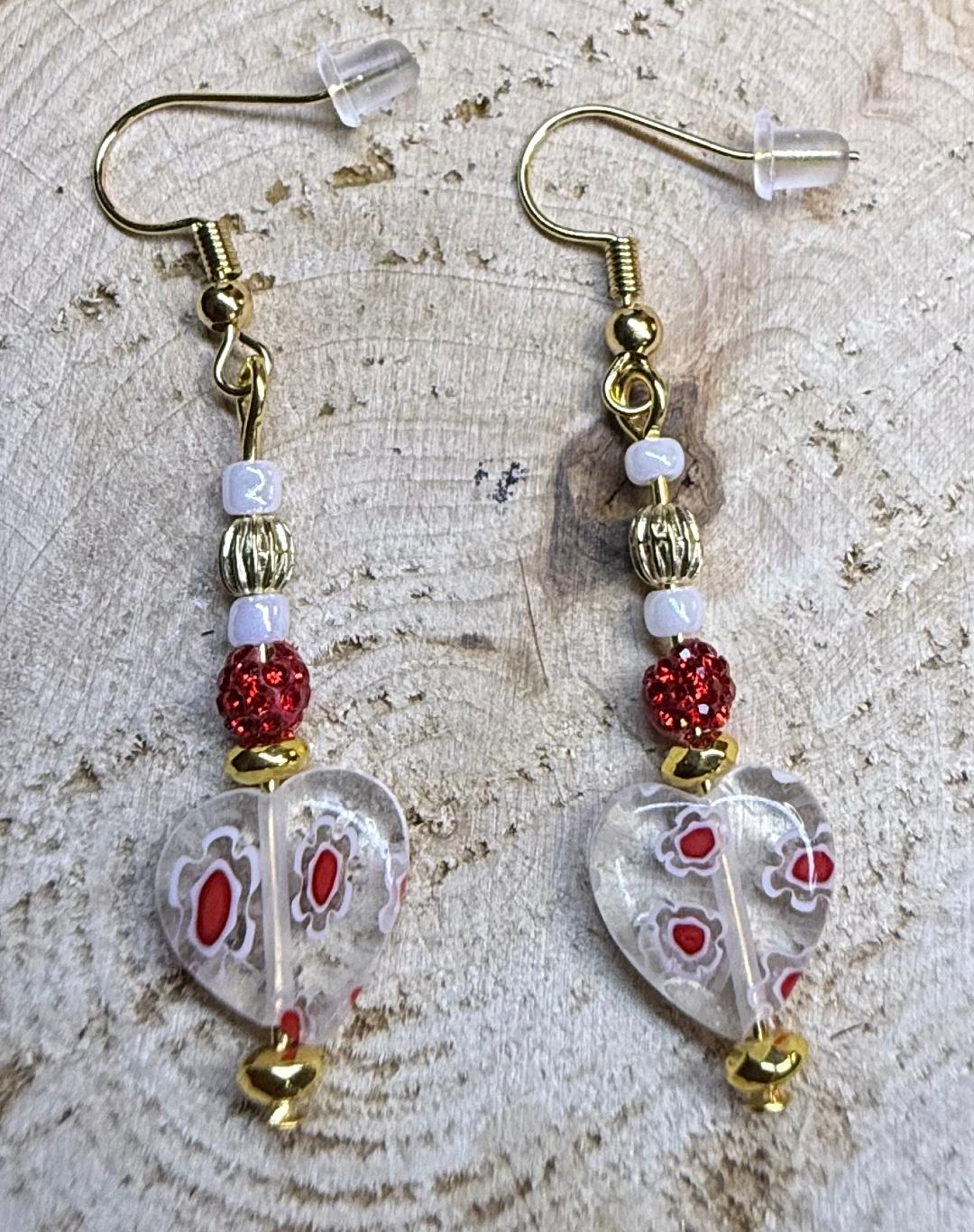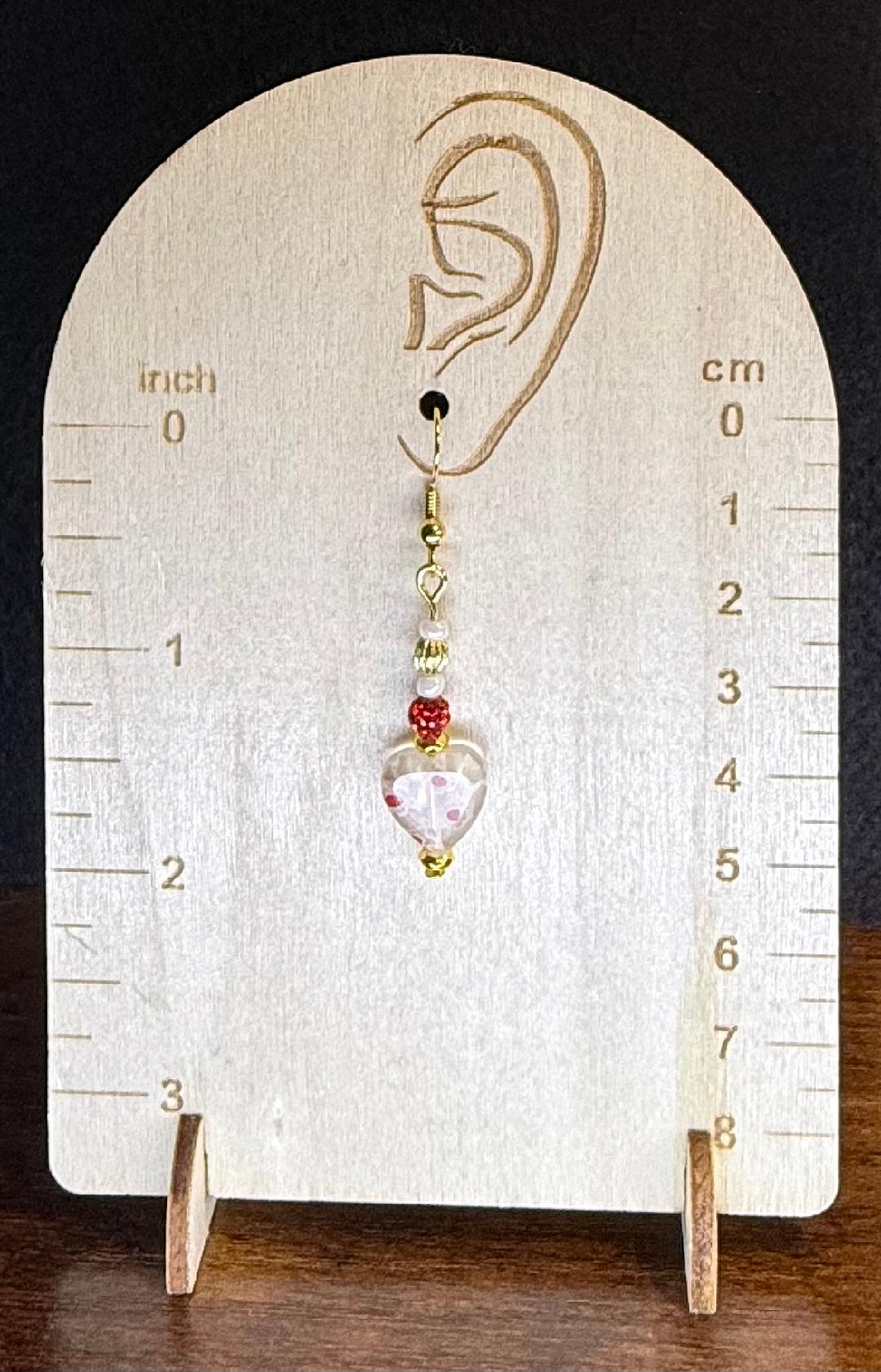 NEW GLASS HEART EARRINGS W/ RED SPARKLING BEADS