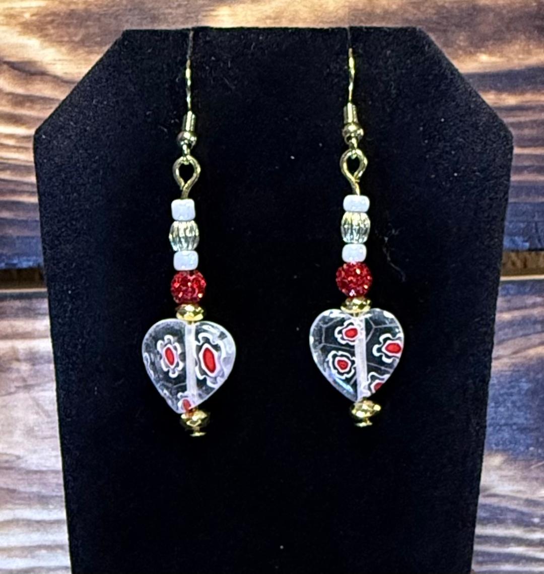 ![]() | Item #: 1006178 Click on image to see more pictures! A cute glass heart charm decorated in red & white. Topped with white, gold and red rhinestone round beads. Made with gold plated, nickel free earring hooks. Measurement Questions? Price: 17.00 |