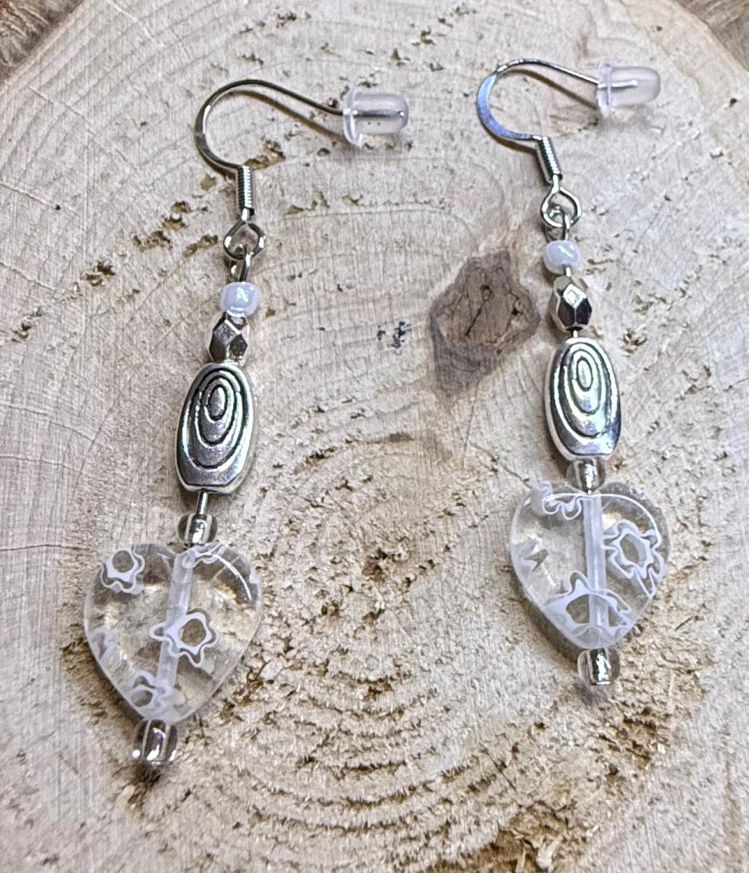 NEW GLASS HEART EARRINGS W/ SILVER SWIRL BEADS