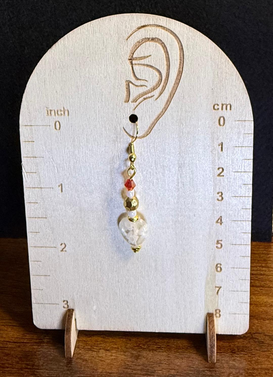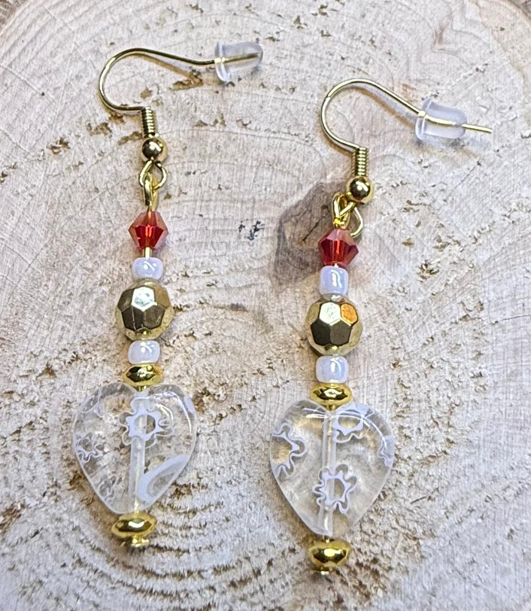 NEW GLASS HEART EARRINGS W/ RED & GOLD FACETED BEADS