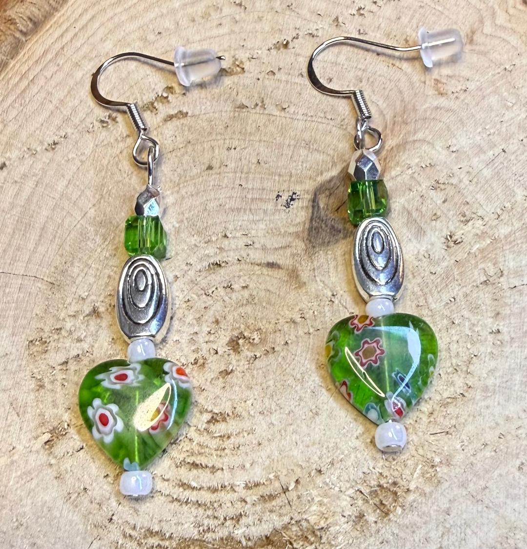 NEW GLASS HEART EARRINGS W/ SQUARE GLASS BEADS & SWIRL CHARMS