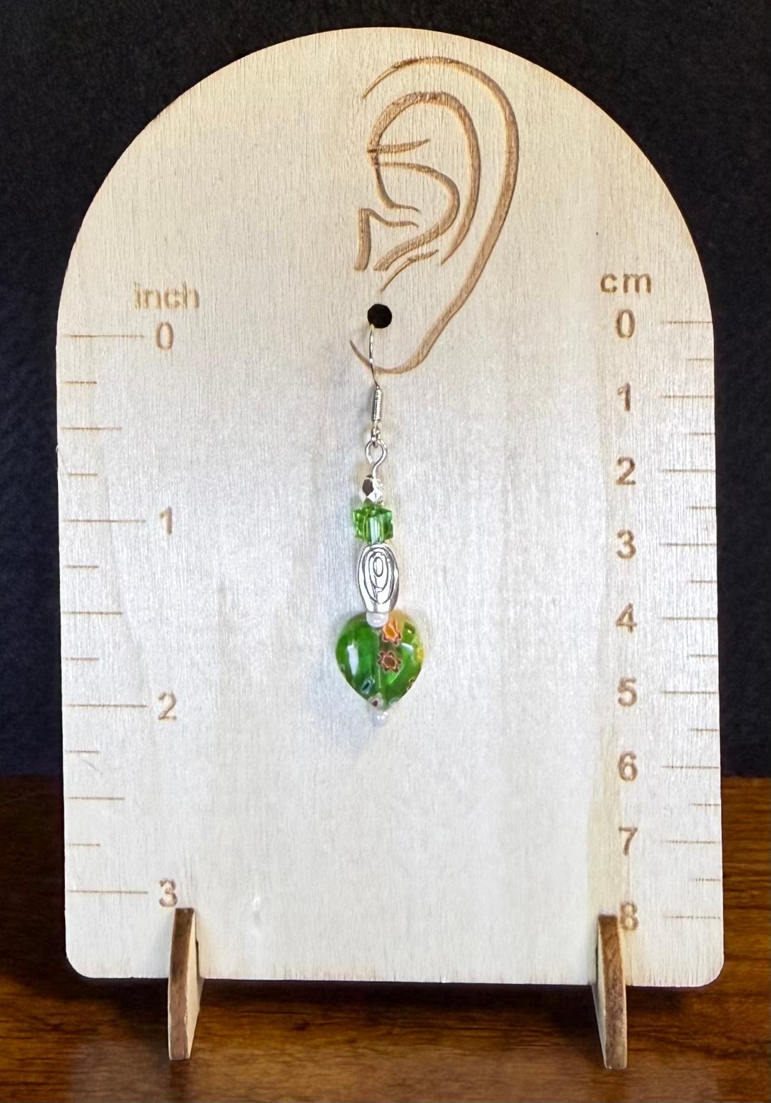 ![]() | Item #: 1006181 Click on image to see more pictures! A cute green glass heart charm decorated with various color flowers. Topped with a square glass faceted bead and silver faceted bead, as well as white seed beads and a silver swirl charm. Made with nickel free earring hooks. Measurement Questions? Price: 17.00 |