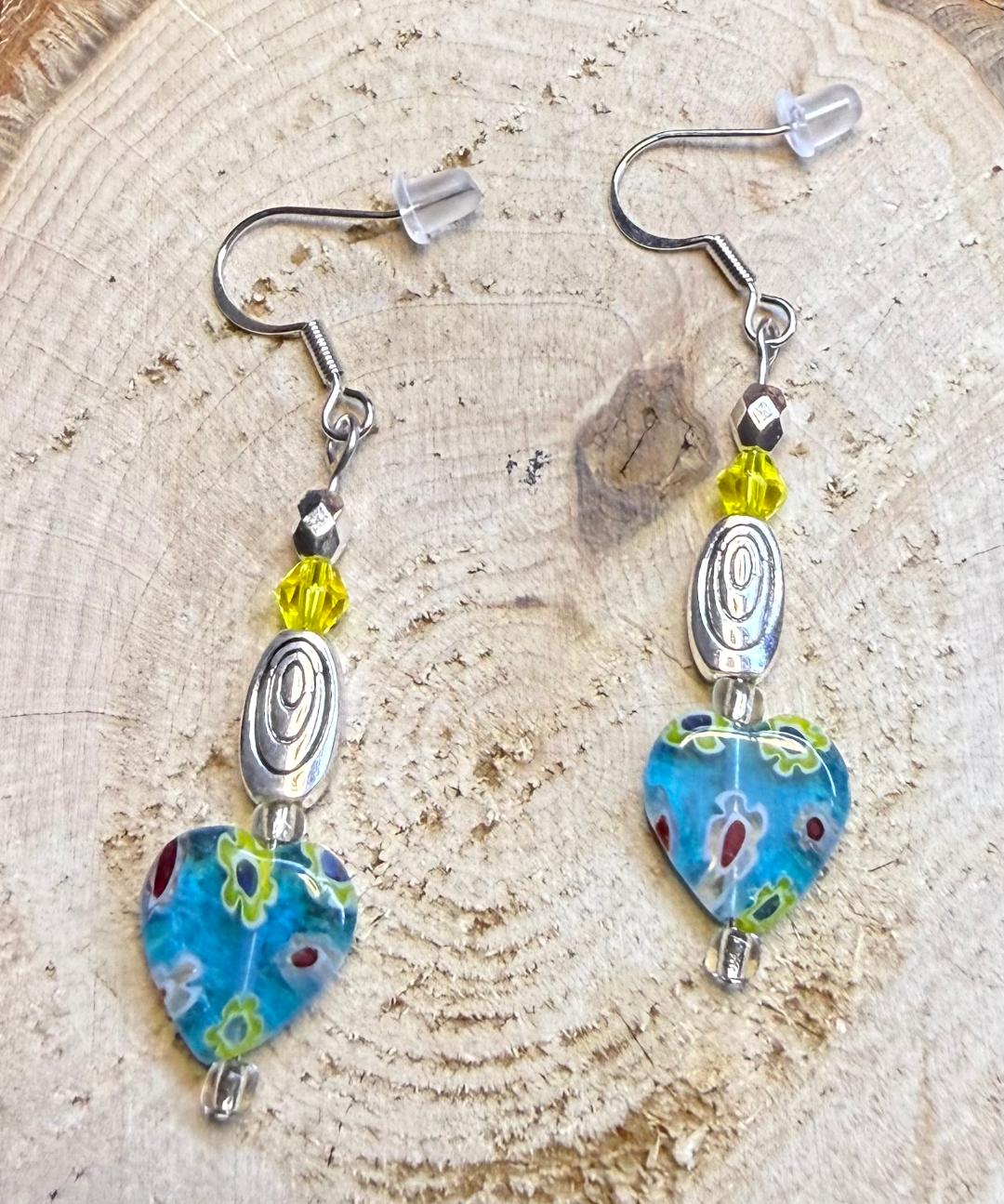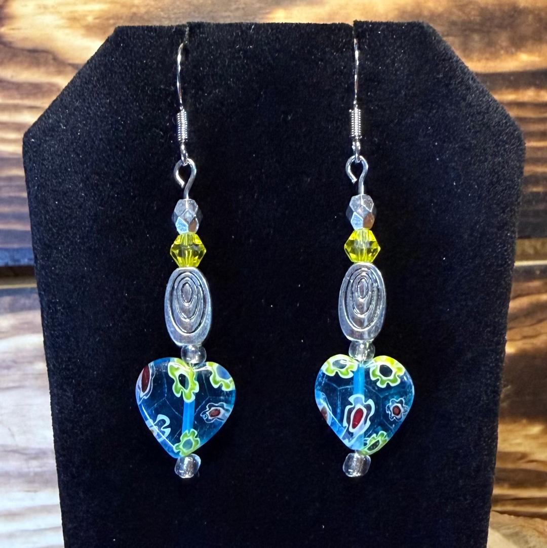 NEW GLASS HEART EARRINGS W/ YELLOW BEADS & SWIRL CHARMS
