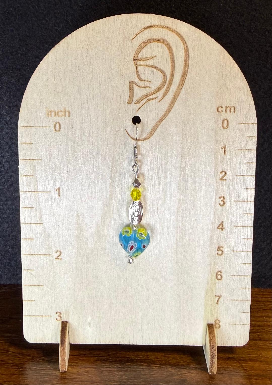 ![]() | Item #: 1006182 Click on image to see more pictures! A cute teal glass heart charm decorated with various color flowers. Topped with a faceted yellow glass faceted bead and silver faceted bead, as well as a silver swirl charm. Made with nickel free earring hooks. Measurement Questions? Price: 17.00 |