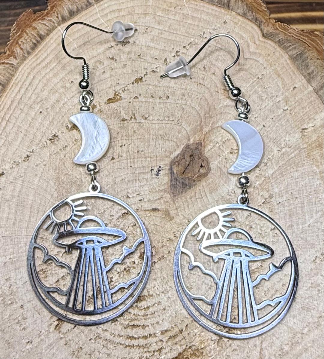 NEW SILVER STAINLESS STEEL SPACESHIP CHARM EARRINGS W/ WHITE SHELL MOONS