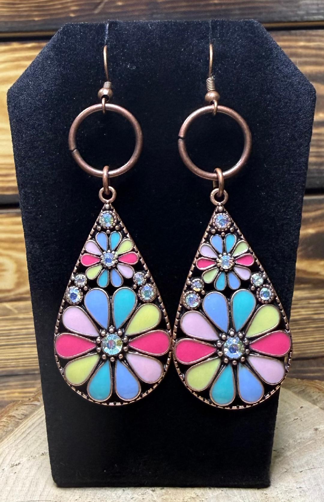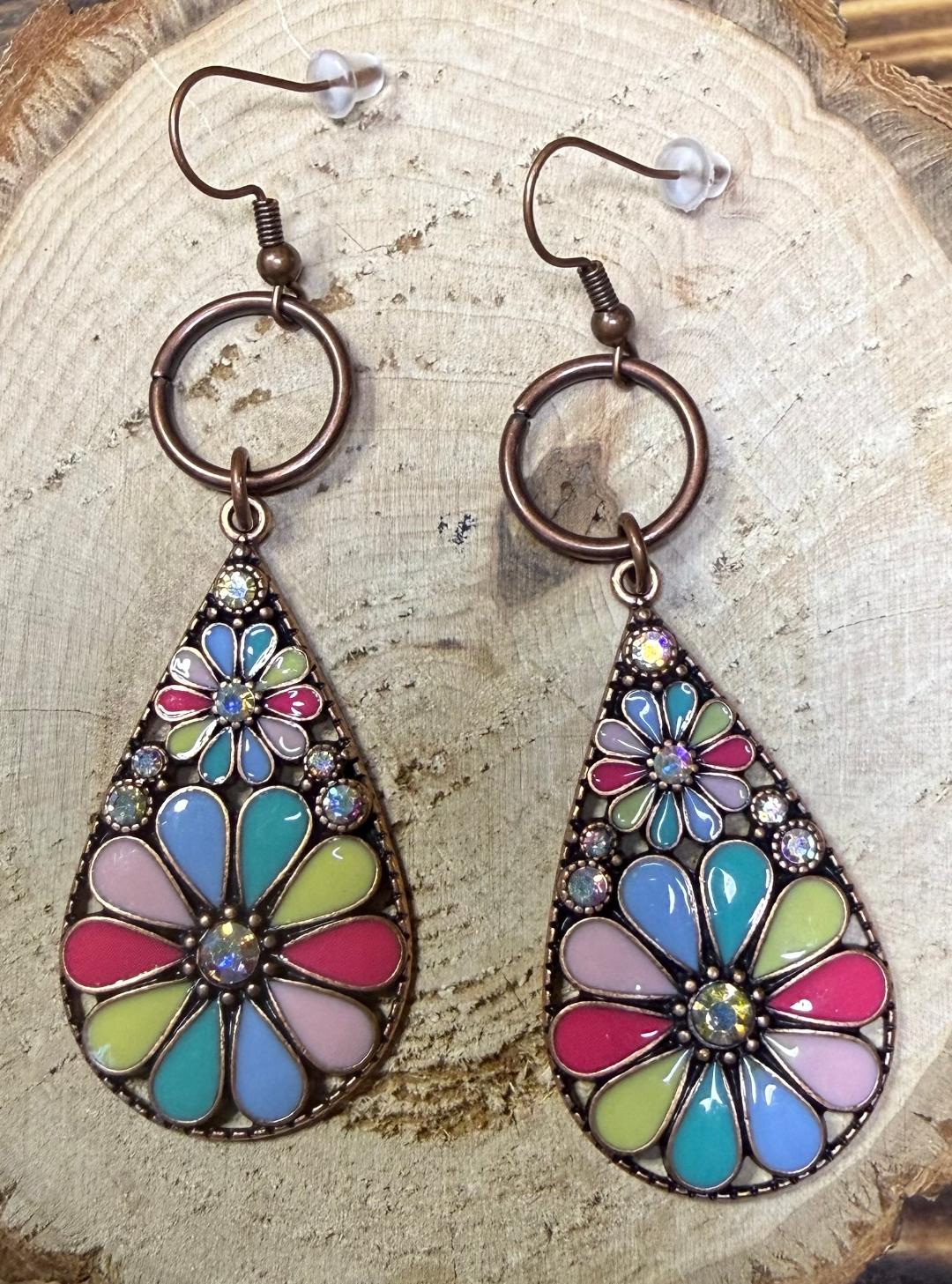 ![]() | Item #: 1006189 Click on image to see more pictures! Large antique copper red color teardrop earrings, decorated with multicolor enamel daisy flowers and iridescent rhinestones for a sparkling effect. Topped with a like color ring charm. They are a bit heavy, very dramatic look. Measurement Questions? Price: 16.00 |