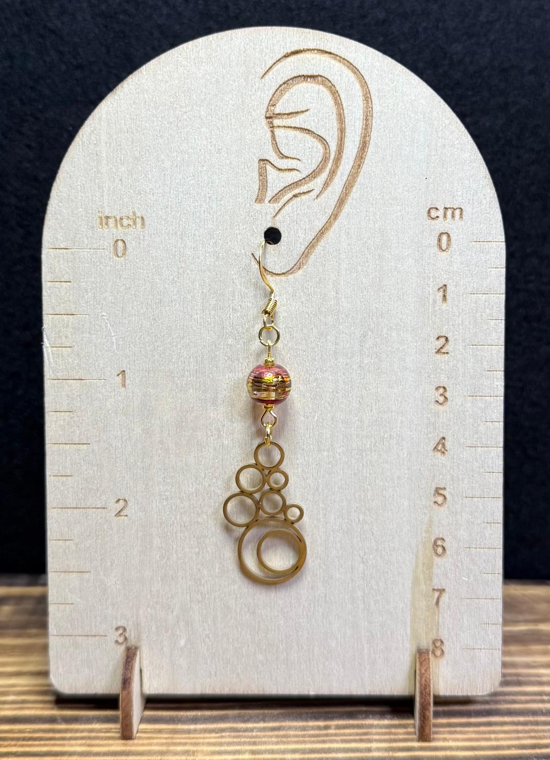![]() | Item #: 1006195 Click on image to see more pictures! A mod pair of gold stainless steel earrings which resemble a cluster of bubbles or circles. They are topped with round glass beads that are painted with gold and burgundy metallic paint. Made with 18K gold plated, nickel free earring hooks. Measurement Questions? Price: 20.00 |