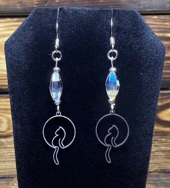 ![]() | Item #: 1006232 Click on image to see more pictures! A cute little cat with a hanging tail made in silver stainless steel. Topped with an elongated iridescent clear glass faceted bead. Made with nickel free earring hooks. Measurement Questions? Price: 16.00 |