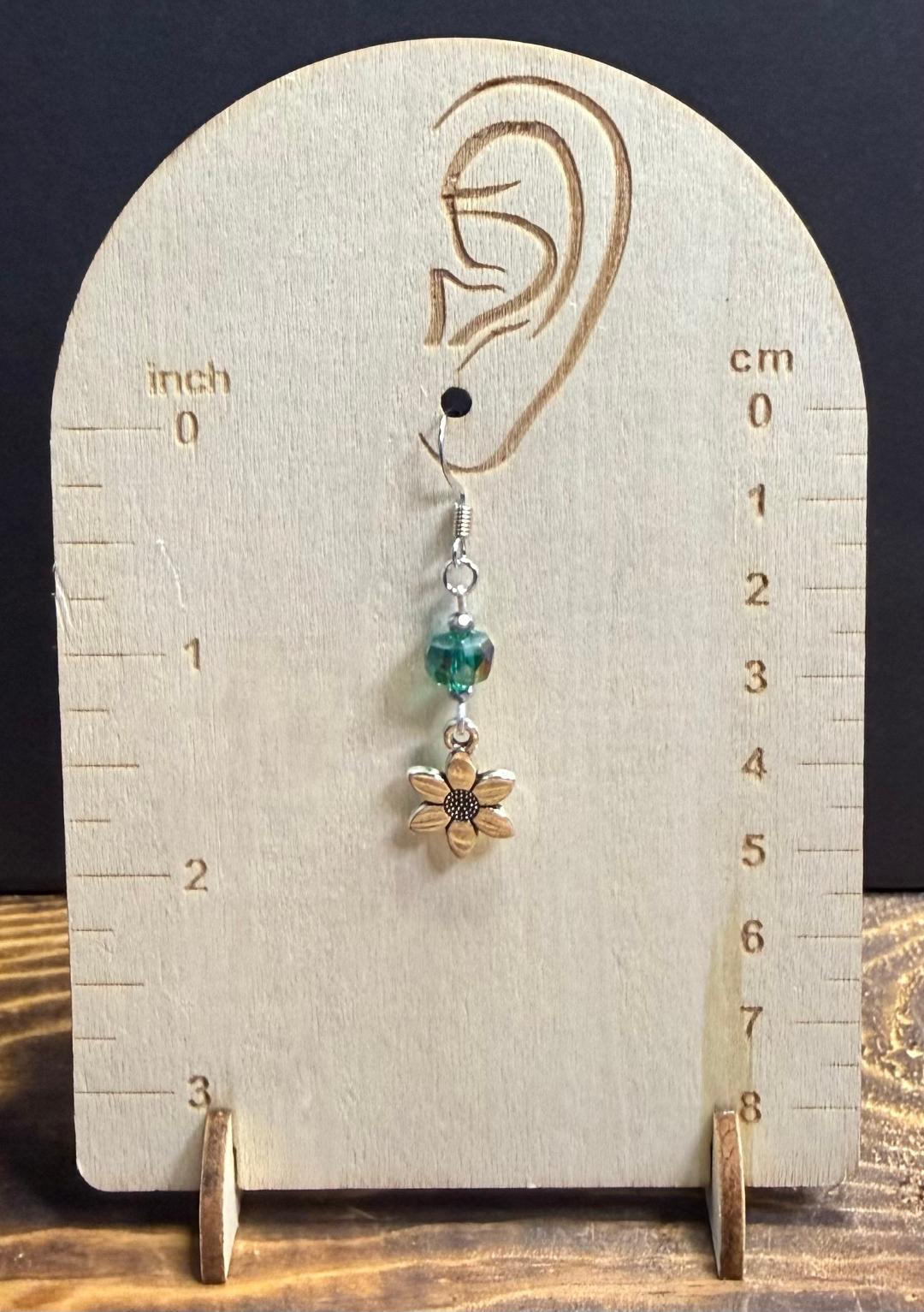 NEW DOUBLE SIDED SILVER FLOWER CHARM EARRINGS W/ FOREST GREEN GLASS BEADS