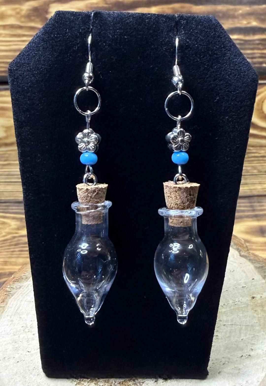 NEW CLEAR GLASS BOTTLE EARRINGS W/ FLOWER & BLUE BEADS