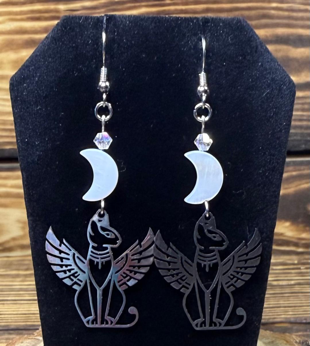 ![]() | Item #: 1006302 Click on image to see more pictures! Dramatic silver stainless steel earrings featuring Bastet, the Egyptian winged cat. Topped with a smooth and shiny, real shell moon charm, as well as a faceted glass clear bead. Made with nickel free earring hooks. Measurement Questions? Price: 21.00 |